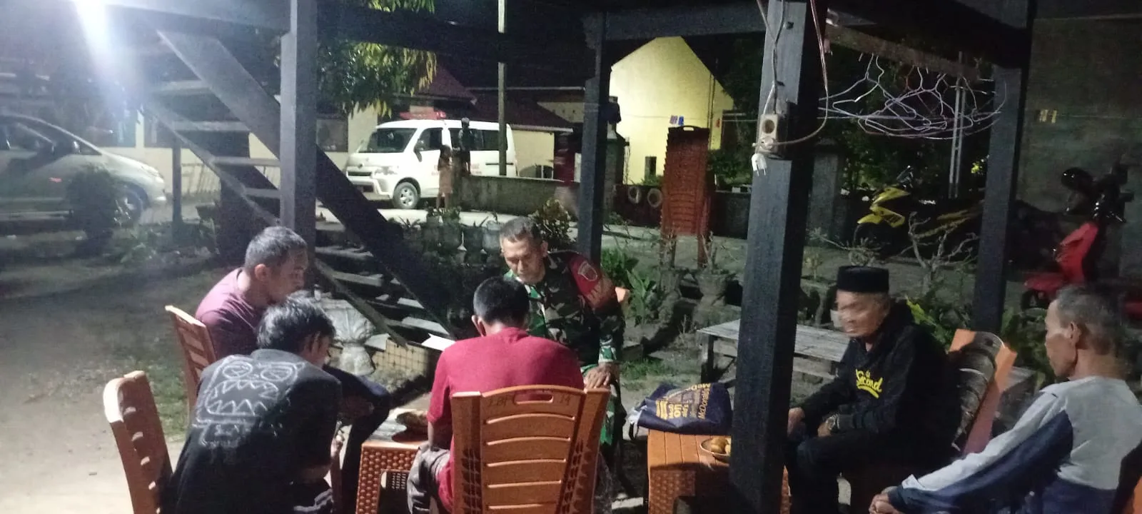 Pinrang_ Babinsa Koramil 1404-03/Mattiro Bulu, Sertu Tamrin melaksanakan kegiatan pemantauan wilayah malam hari yang dilanjutkan dengan komunikasi sosial (Komsos) bersama warga binaan di Dusun Cora, Desa Padaelo, Kecamatan Mattiro Bulu, Kabupaten Pinrang, Kamis (11/12/2025).