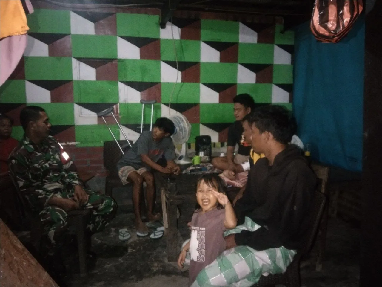 Pinrang_ Babinsa Koramil 1404-06/Duampanua Kodim 1404/Pinrang Sertu Masruhin melaksanakan patroli malam yang dilanjutkan dengan kegiatan komunikasi sosial (komsos) bersama warga di Kelurahan Pekkabata, Kecamatan Duampanua, Kabupaten Pinrang, Kamis (27/11/2025).