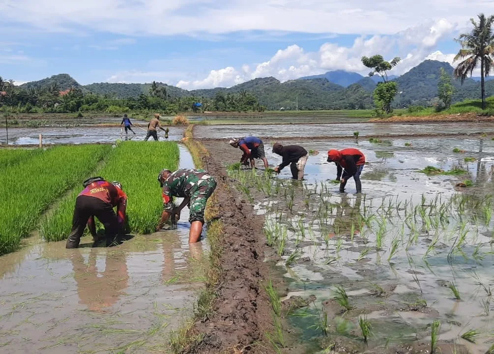 Pinrang_ Dalam rangka mendukung program ketahanan pangan nasional, Babinsa Koramil 1404-07/Lembang Kodim 1404/Pinrang, Sertu Ismail Malla, melaksanakan pendampingan pertanian dengan membantu petani menanam padi di wilayah binaan, tepatnya di Dusun Rantoni, Desa Pakeng, Kecamatan Lembang, Kabupaten Pinrang, Minggu (18/01/2026).