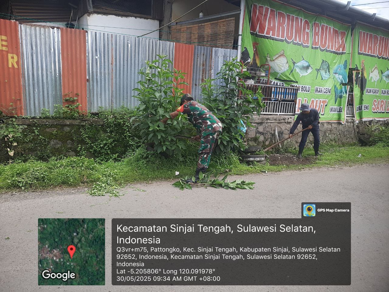 Sinjai – Dalam upaya menjaga kebersihan lingkungan dan memperkuat kemanunggalan TNI dengan rakyat, Babinsa Koramil 1424-03/Sinjai Tengah, Serda Asri Bahe bersama masyarakat melaksanakan kegiatan karya bakti pembersihan selokan di sekitar Masjid Miftahul Khair, Dusun Sompong, Desa Pattongko, Kecamatan Sinjai Tengah, Kabupaten Sinjai, Jumat (30/05/2025).