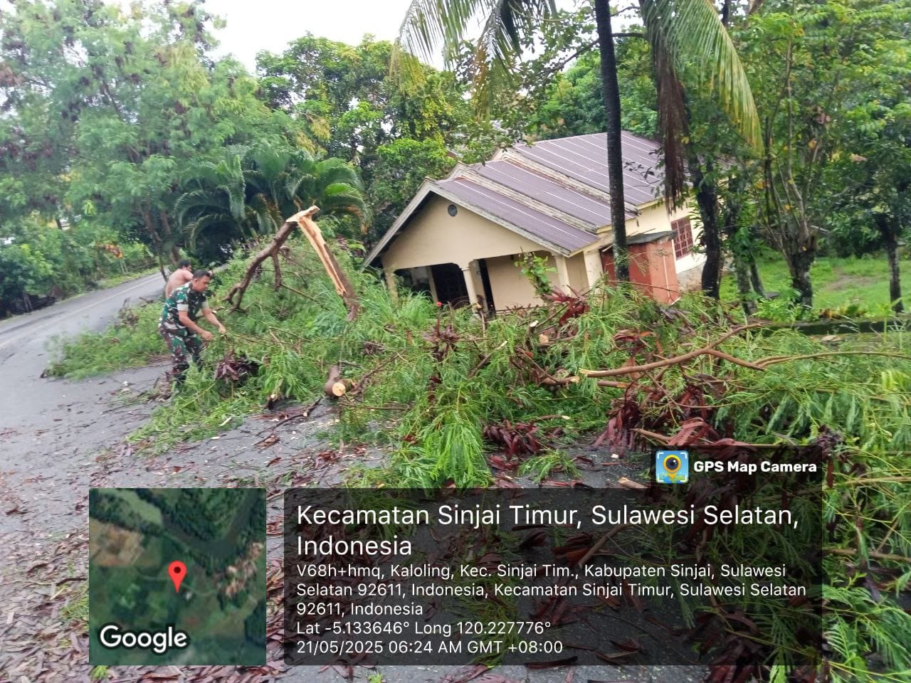 Babinsa Koramil 1424-04/Sinjai Timur Bersama Warga Gotong Royong Bersihkan Ranting Pohon Di Bahu Jalan