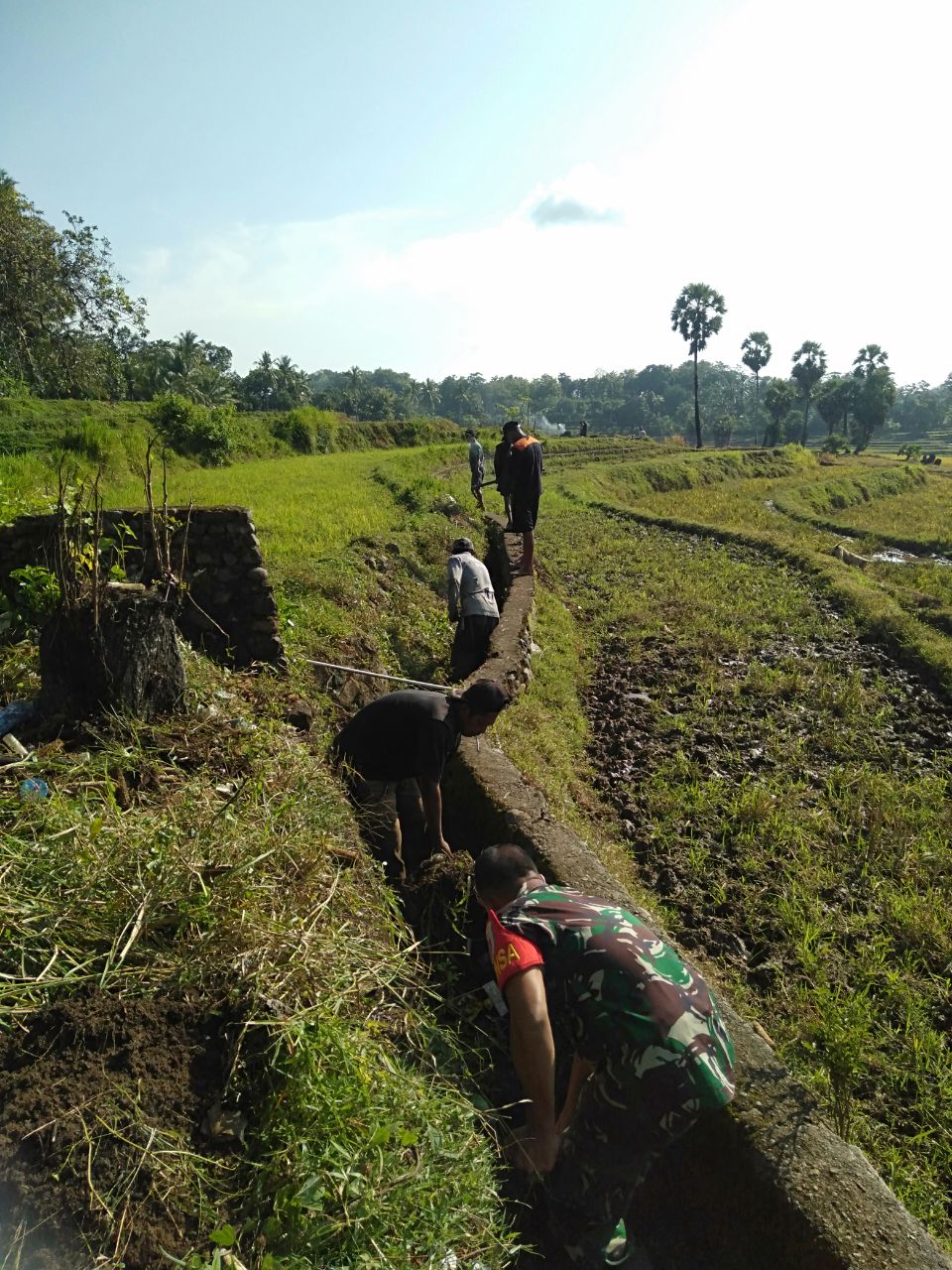 Dalam kegiatan tersebut, warga tampak antusias bekerja sama membersihkan sampah dan endapan lumpur yang menghambat aliran air di irigasi. Serda Abd Rasyid turut terjun langsung di lapangan, memberikan semangat kepada warga dan memastikan jalannya kegiatan berlangsung dengan aman dan tertib.