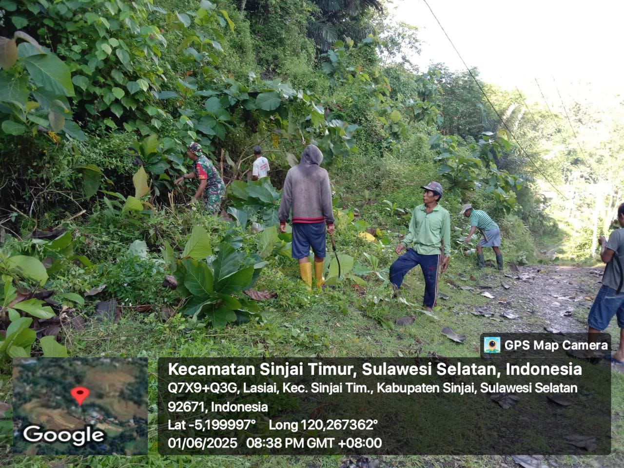 Sinjai – Dalam upaya menjaga kebersihan lingkungan dan meningkatkan kesadaran masyarakat terhadap potensi bencana alam, Babinsa Koramil 1424-04/Sinjai Timur, Koptu Akbar, bersama warga melaksanakan kegiatan Karya Bakti pembersihan jalan di Dusun Wae Tua, Desa Lasiai, Kecamatan Sinjai Timur, Kabupaten Sinjai, Minggu (01/06/2025)