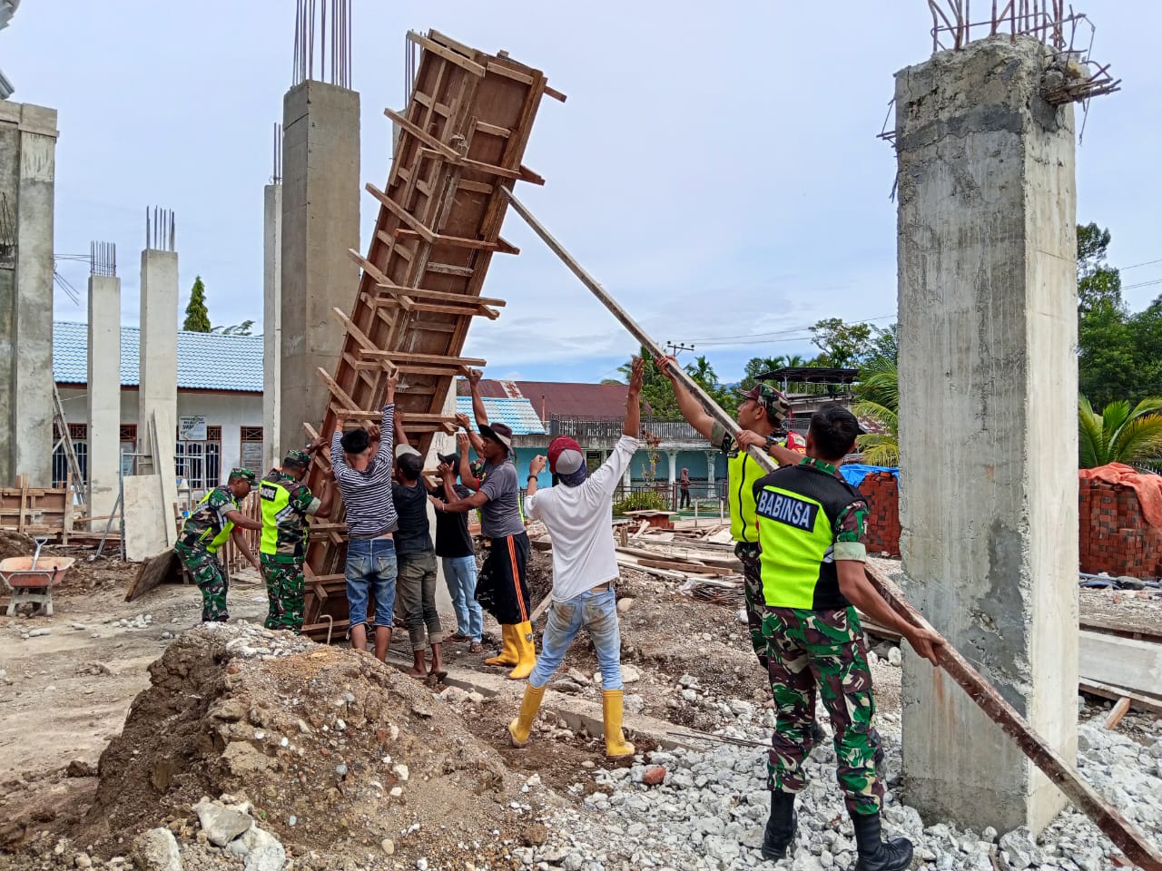 Suasana kebersamaan terlihat jelas di lapangan. Warga bersama Babinsa bahu-membahu mengangkat, merakit, dan memasang mal tiang masjid. Pembangunan Masjid Syuhada sendiri menjadi harapan besar masyarakat Bangkeh sebagai pusat kegiatan keagamaan dan sosial.