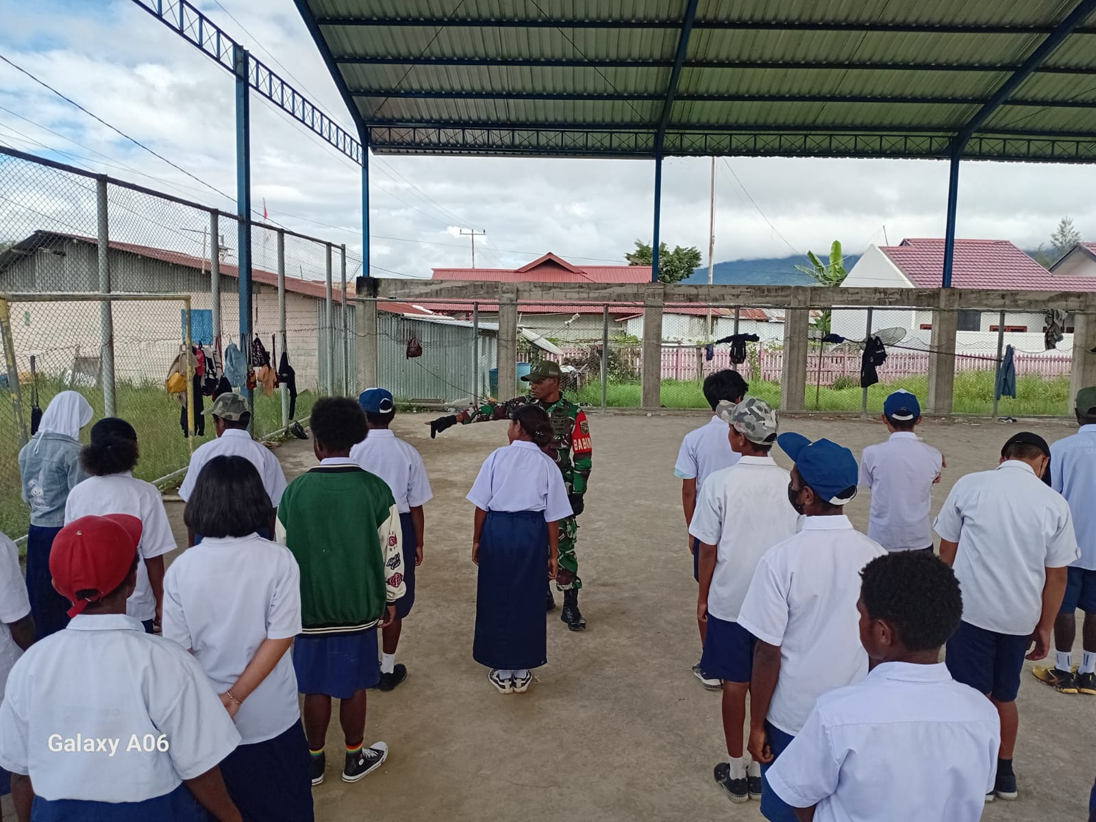 Babinsa Koramil 1703-02/Tigi Ajari Pelatihan Gerak Jalan, PBB (Peraturan Baris Berbaris) siswa-siswi di SMPN 1 Tigi