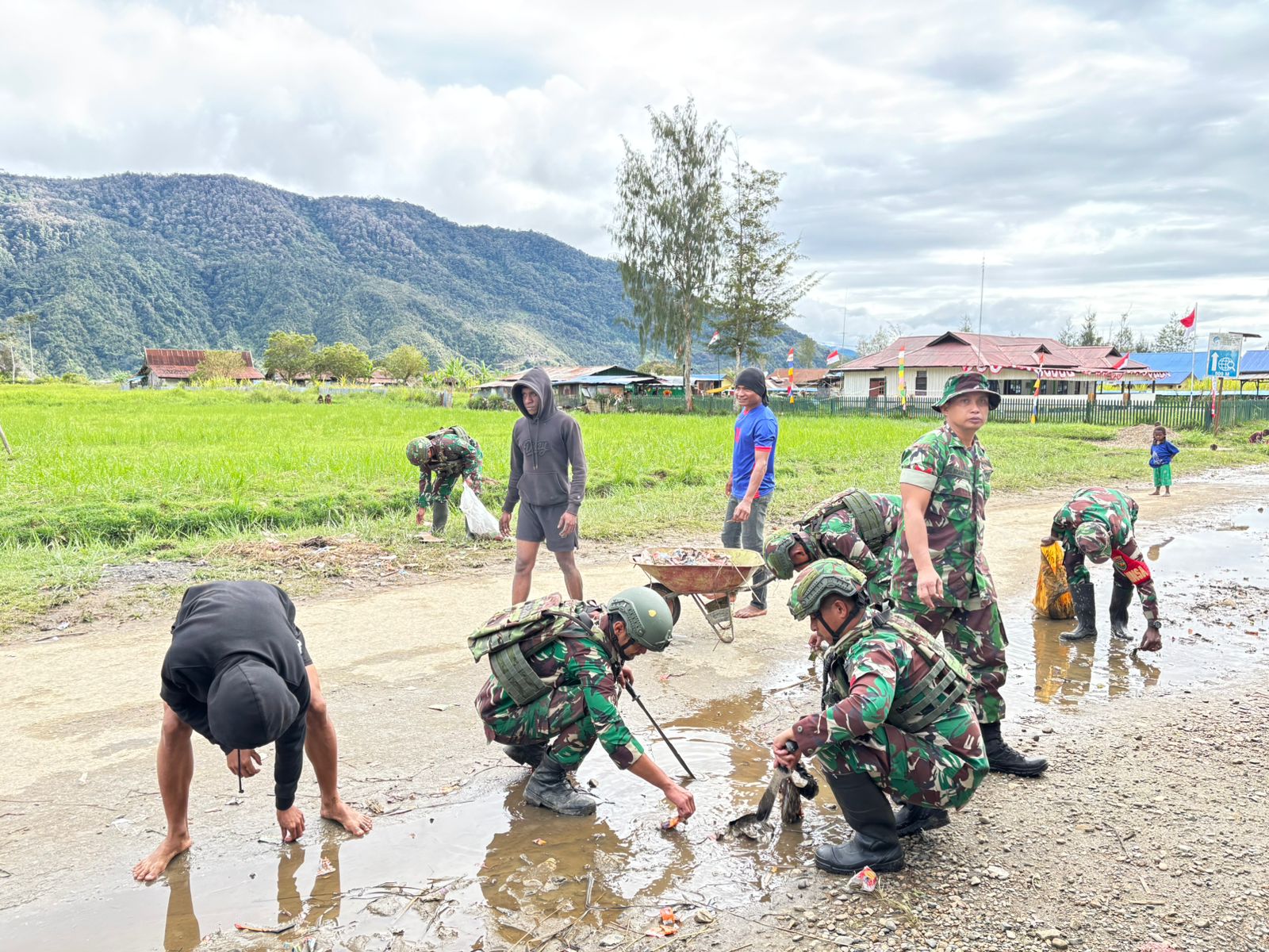 Obano – Untuk menjaga kebersihan di wilayah binaan, Babinsa Koramil 1703-03/Obano Serda Ronaldo Asem, bersama 1 orang rekan babinsa beserta warga kerja bakti membersihkan sampah-sampah di jalan Kampung Obano, Distrik Paniai Barat, Kabupaten Paniai, Prov.Papua Tengah. Senin,(01/09/2025).