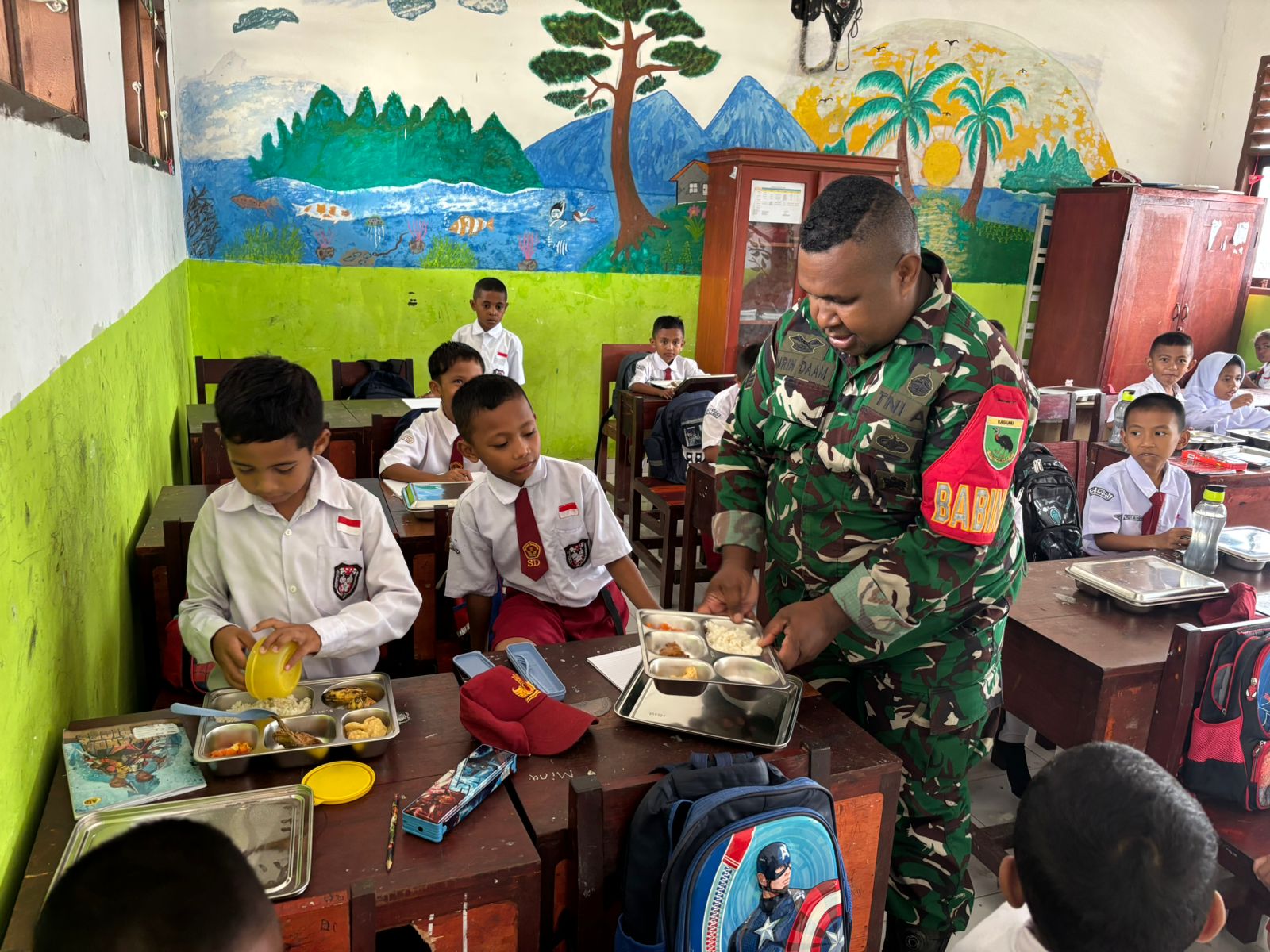 Raja Ampat,PBD-Babinsa Koramil 1805-01/Waisai Serka Ambrin dam Bersama melaksanakan monitoring dan pendampingan pendistribusian makan bergizi gratis kepada Siswa- Siswi SD N 2 Raja Ampat yg berada di Waisai kota Kab.Raja Ampat ,Rabu(13/08/2025).