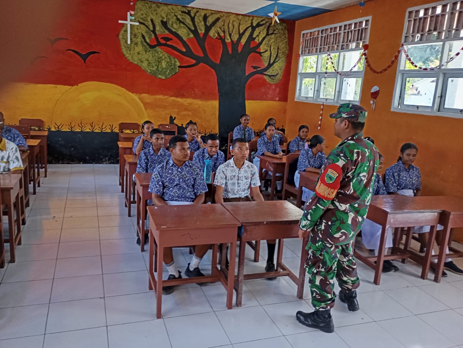 Raja Ampat,PBD – Babinsa Koramil 1805-03/Samate Kodim 1805/Raja Ampat, Sertu Murdi melaksanakan kegiatan Wawasan Kebangsaan (Wasbang) kepada Siswa-Siswi SPMN 14 Raja Ampat yang bertempat di Kampung Kalwal, Distrik Salawti Tengah, Kabupaten Raja Ampat, Sabtu (26/04/2025).