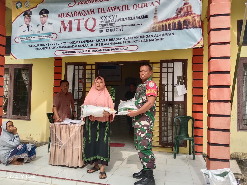 ACEH SELATAN – Babinsa Koramil 04/Pasi Raja, Kodim 0107/Aceh Selatan Serda Sulomo, melaksanakan pendampingan pada kegiatan penyaluran bantuan pangan berupa beras dari pemerintah kepada masyarakat Desa Ujung Padang Asahan Kecamatan Pasi Raja, Senin (18/8/2025).