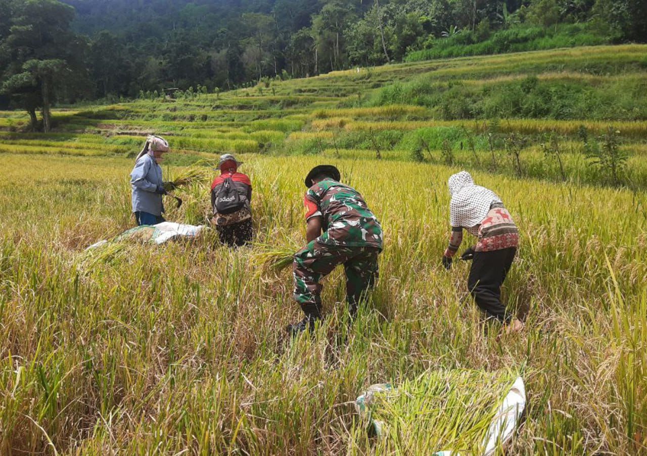 SINJAI. Babinsa Desa Pattongko Koramil 1424-03/Sinjai Tengah, Serda Asri Bahe melaksanakan kegiatan pemantauan sekaligus pendampingan panen padi bersama Kelompok Tani Mekar Sari milik Bapak Abdullah di Dusun Sompong, Desa Pattongko, Kecamatan Sinjai Tengah.(01/09/2025)