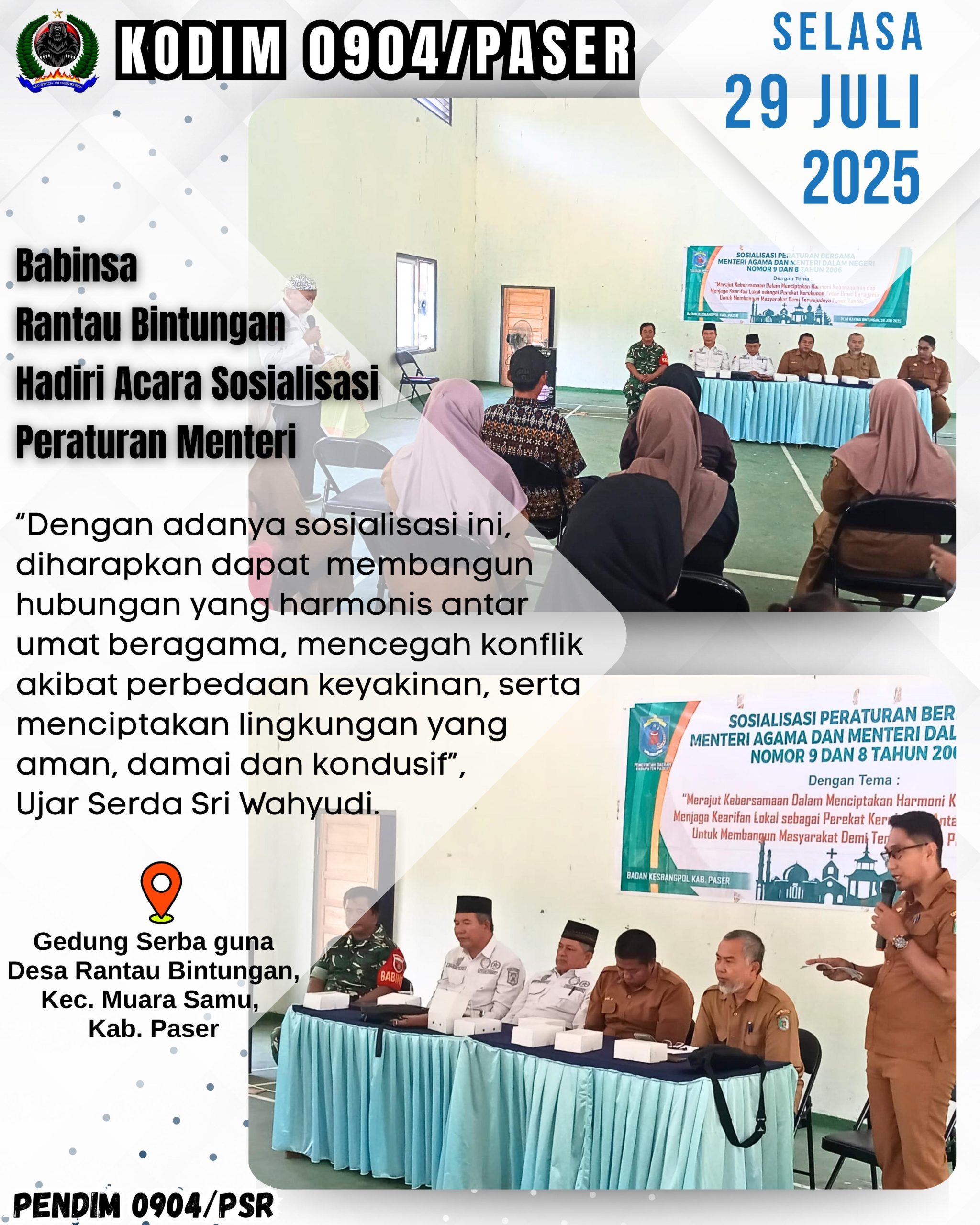 Kodim 0904/Psr, Korem 091/ASN, Kodam VI/Mlw – Babinsa Rantau Bintungan Serda Sri Wahyudi Menghadiri Acara Sosialisasi Peraturan Bersama Menteri Agama dan Menteri Dalam Negeri Nomor 9 dan 8 Tahun 2006 bertempat di Gedung Serba guna Desa Rantau Bintungan, Kec. Muara Samu, Kab. Paser, Selasa (29/7/25).