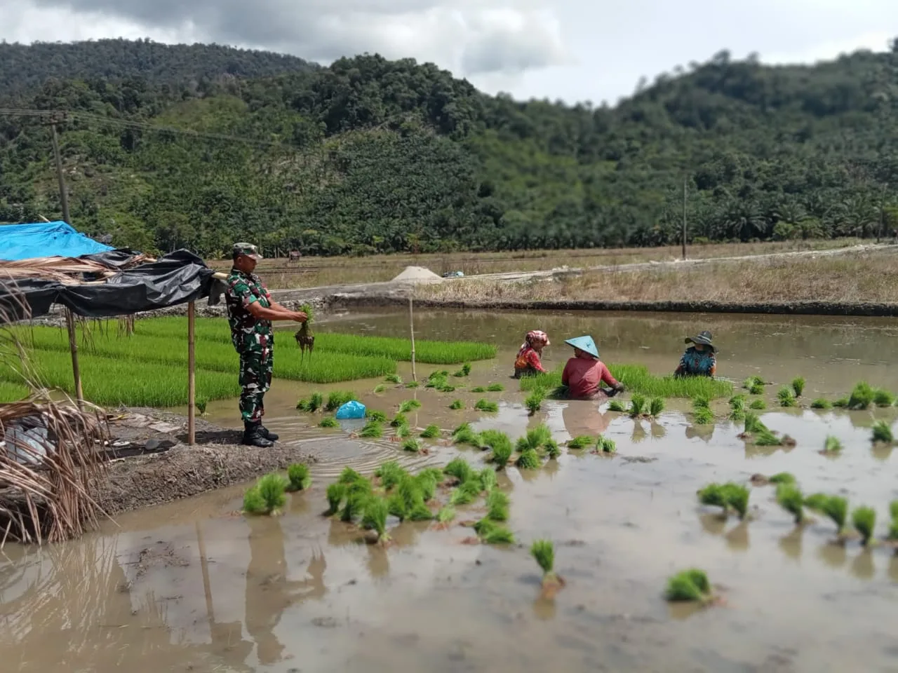 Dengan sepatu lapangan penuh lumpur dan semangat yang tidak luntur, Sertu Edi tampak bekerja bersama para petani mulai dari menyiapkan lahan hingga mengatur bibit padi yang akan dipindahkan ke petakan sawah. Pendampingan tersebut bukan hanya bersifat teknis, tetapi juga menjadi dorongan moral bagi para petani agar tetap produktif dan bersemangat.