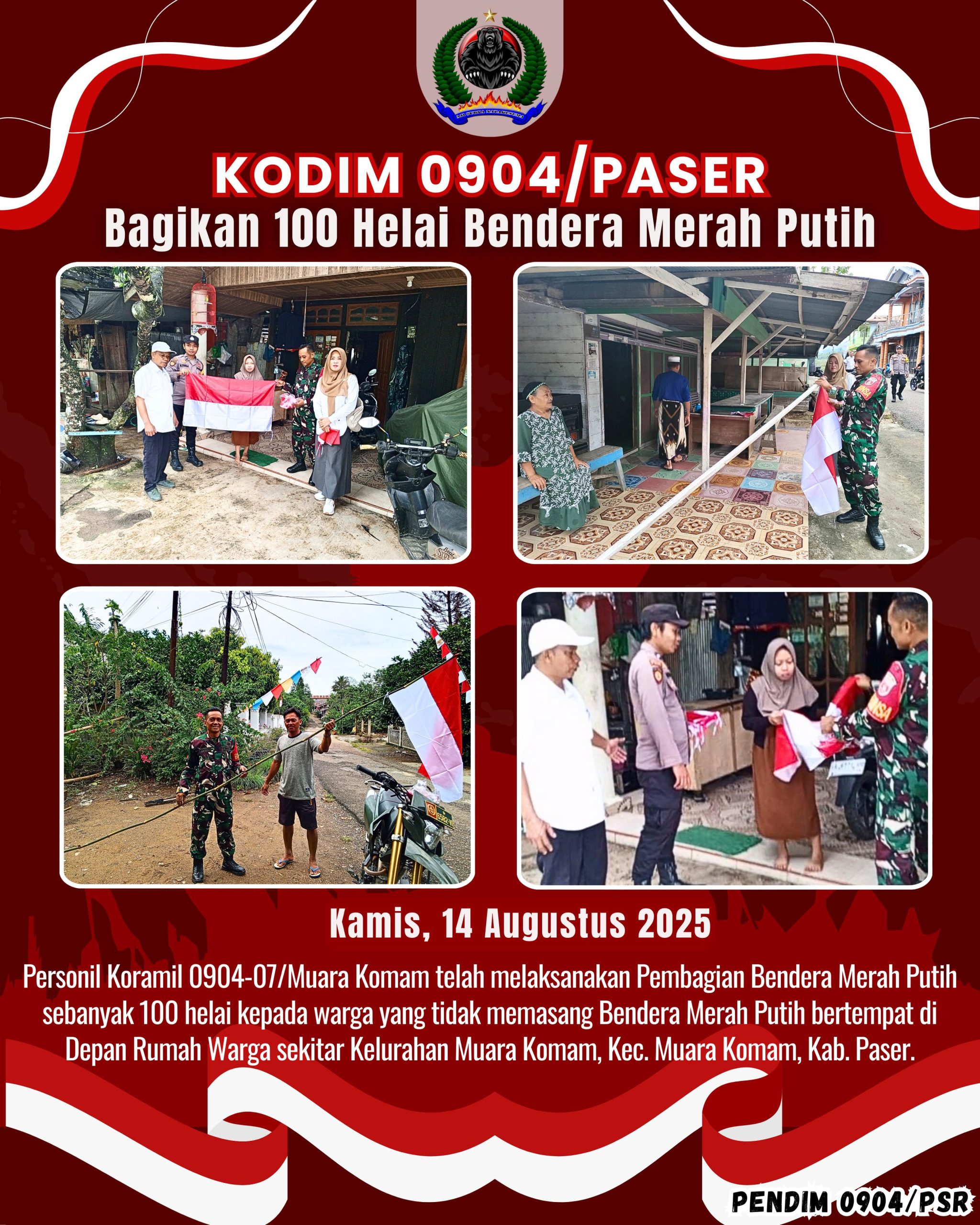 Kodim 0904/Psr, Korem 091/ASN, Kodam VI/Mlw – Personil Koramil 0904-07/Muara Komam telah melaksanakan Pembagian Bendera Merah Putih sebanyak 100 helai kepada warga yang tidak memasang Bendera Merah Putih bertempat di Depan Rumah Warga sekitar Kelurahan Muara Komam, Kec. Muara Komam, Kab. Paser, Kamis (14/8/2025).