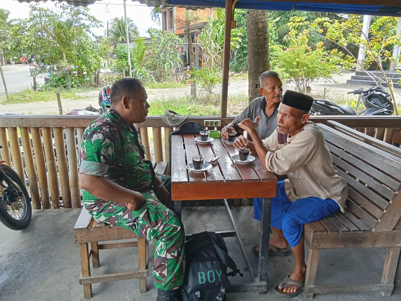 Batuud Koramil 02/Seunagan pelda Candra Surbakti melaksanakan komsos dengan tokoh masyarakat di wilayah binaan di Desa Jeuram Kec. Seunagan Kab. Nagan Raya Senin (02-06-2025)