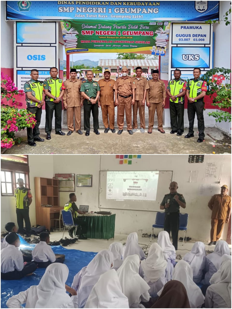 Pidie — Dalam rangka membentuk karakter pelajar yang disiplin, cinta tanah air, sekaligus menanamkan jiwa nasionalisme sejak dini, Danramil 17/Geumpang Kodim 0102/Pidie, Kapten Czi Putut Ariyanto, memberikan materi Wawasan Kebangsaan (Wasbang) kepada para siswa baru SMPN 1 Geumpang. Kegiatan ini berlangsung dalam rangkaian Masa Pengenalan Lingkungan Sekolah (MPLS) yang digelar di kompleks SMPN 1 Geumpang, Desa Bangkeh, Kecamatan Geumpang, Kabupaten Pidie, Rabu (16/07/2027).