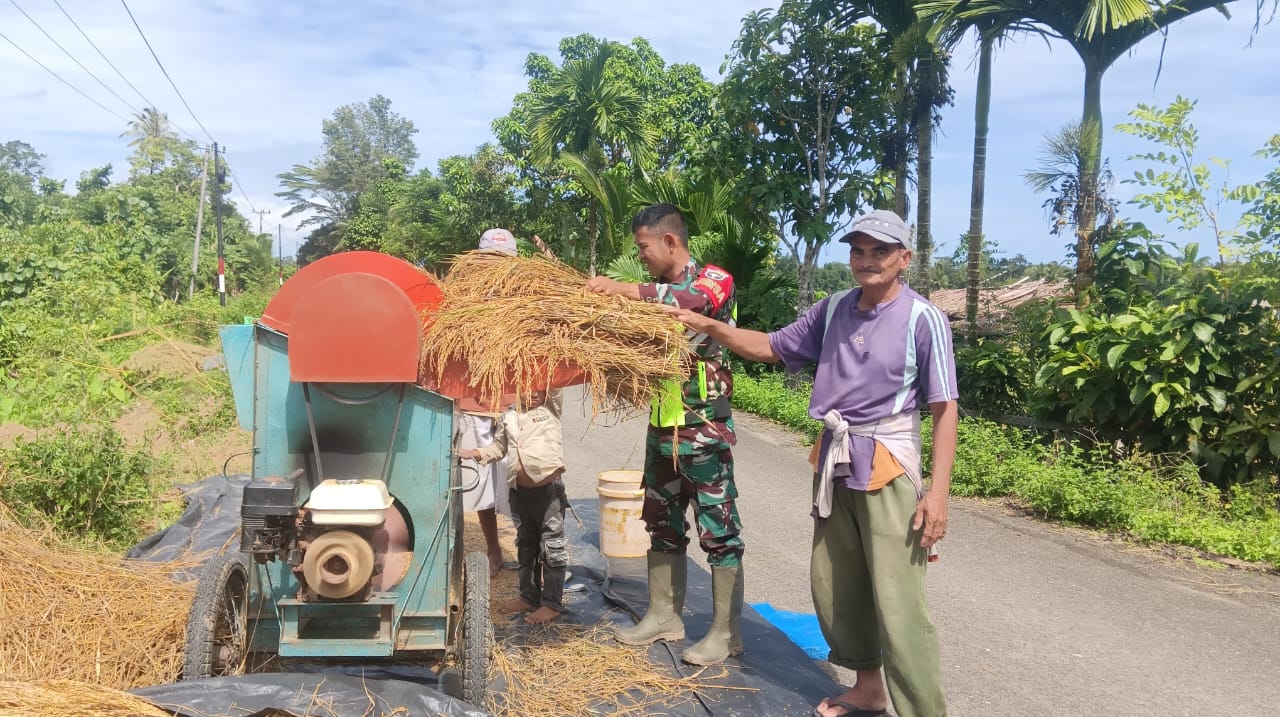 Usai mengarit padi bersama dengan warga di desa binaannya, Pratu Mulky Adamni juga turut bantu petani lakukan perontokan padi dengan menggunakan mesin perontok padi di sawah milik warga desa binaan.