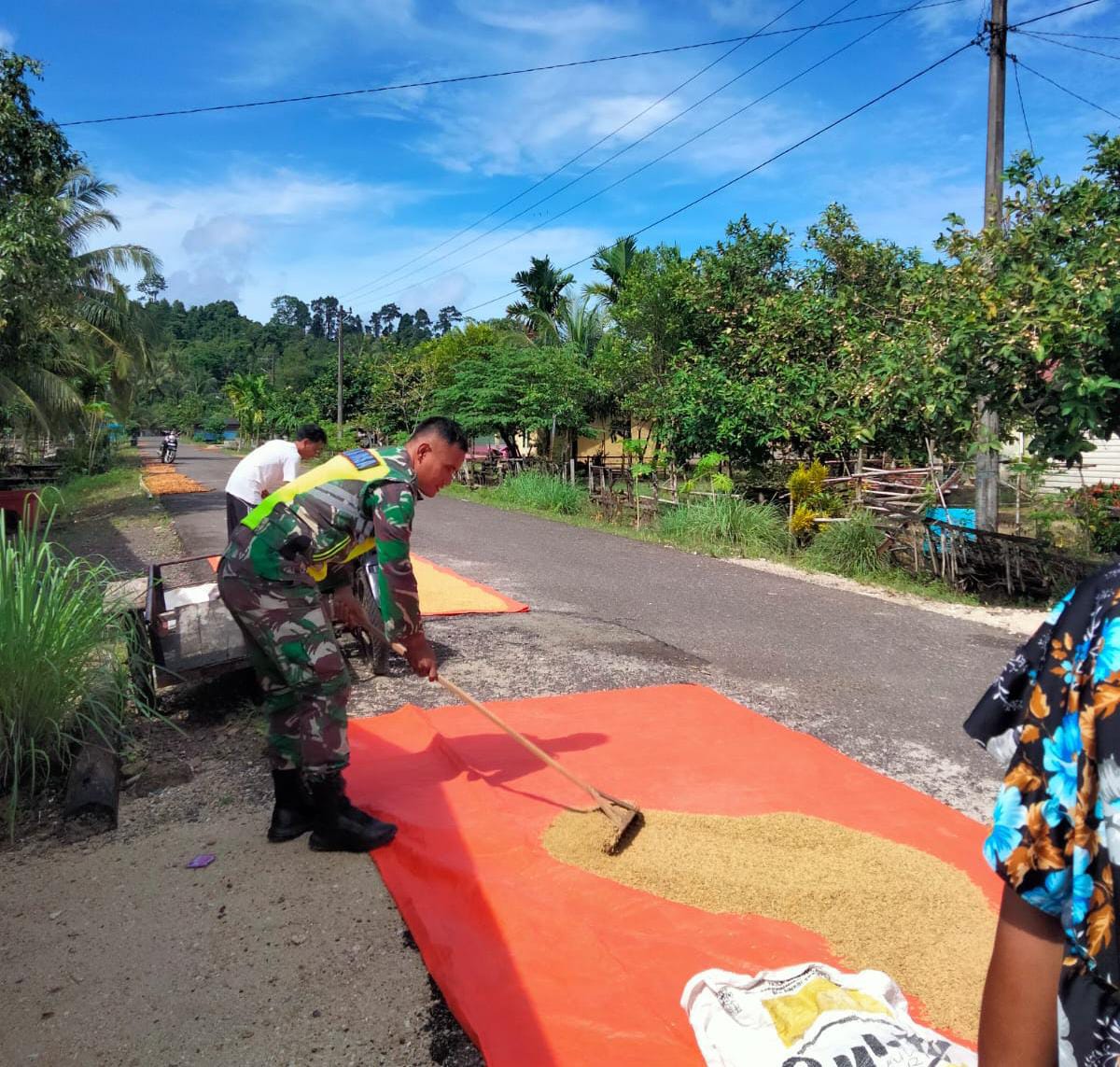 Bentuk Pendampingan Terhadap Petani, Babinsa Alafan Bantu Jemur Padi Hasil Panen