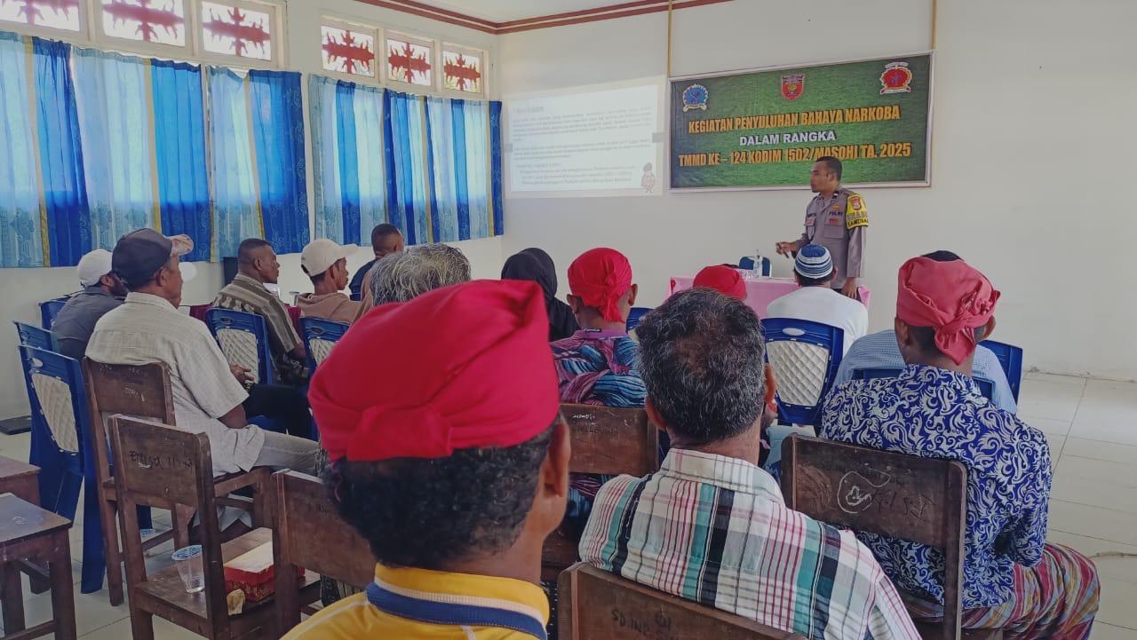 Berkelaborasi dengan Polri, Satgas TMMD ke 124 Kodim 1502/Masohi Ta. 2025 berikan Penyuluhan Bahaya Narkoba yang dilaksanakan di Dsn. Simalow Ds. Sepa Kec. Amahai Kab. Maluku Tengah. Kamis (15/05/2025).