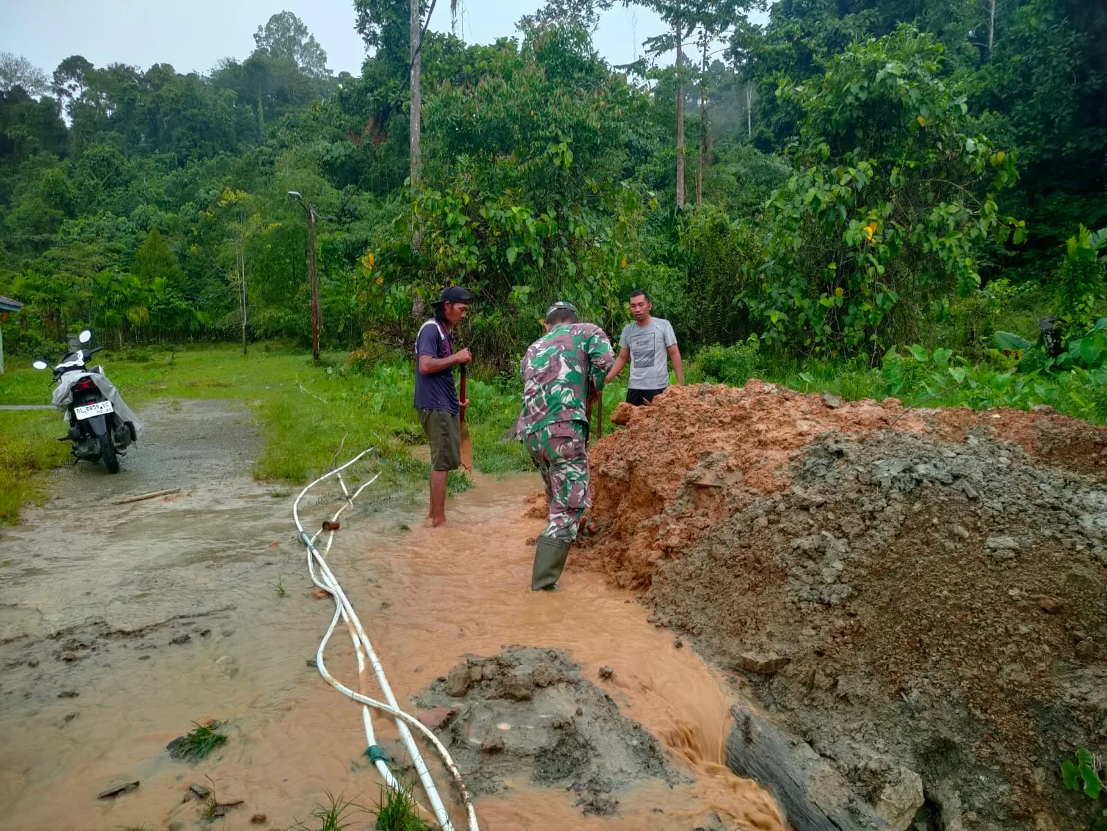 Simeulue – Serda Syahrizal Babinsa Koramil 01/Simeulue Timur, Kodim 0115/Sml, Korem 012/Tu, melaksanakan kerja bakti pembersihan parit kanan kiri jalan bersama masyarakat Desa Air Dingin, Kecamatan Simeulue Timur, Kabupaten Simeulue. Sabtu (04/04/2026).