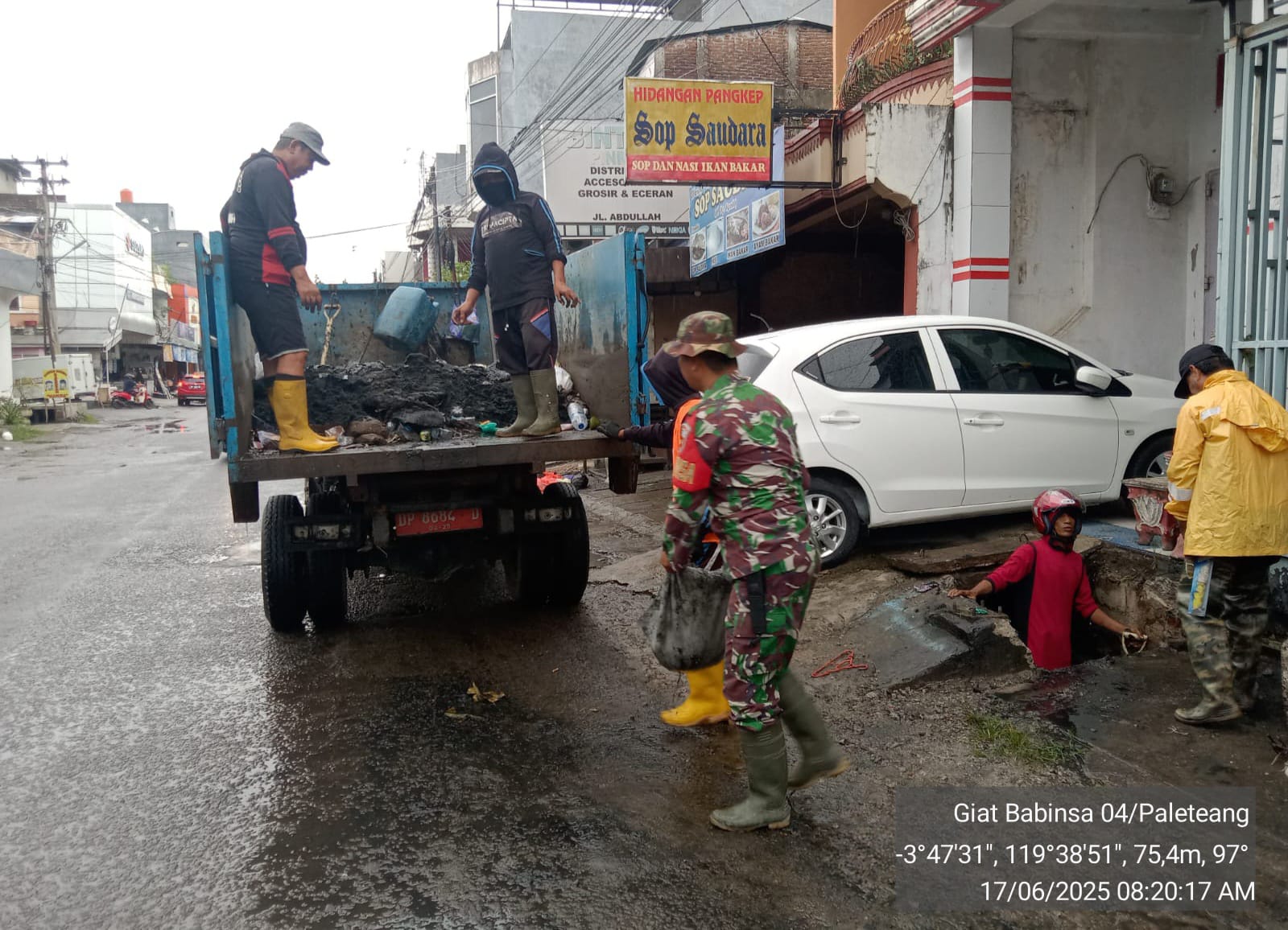 Kerja bakti dipimpin langsung oleh Danramil-04/Paleteang Kapten Cba Ridwan dengan melibatkan Staf Kelurahan, Dinas PURR dan warga setempat dengan sasaran pembersihan saluran air yang tersumbat sampah-sampah rumah tangga dan pasir.
