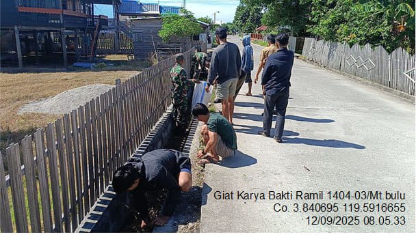 Pinrang_ Untuk mengantisipasi banjir ketika hujan turun serta menjaga kebersihan Lingkungan, Babinsa jajaran Koramil-03/Mattiro Bulu Kodim 1404/Pinrang bersama warga melaksanakan kerja bakti pembersihan parit/saluran air di Dusun Benteng Desa Marannu Kecamatan Mattiro Bulu Kabupaten Pinrang, Jum’at (12/09/2025).