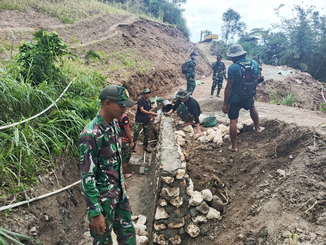 Enrekang — Satgas TMMD ke-125 Kodim 1419/Enrekang bersama warga bahu membahu membangun fondasi penahan di bahu jalan yang rawan longsor, Jumat (08/08/2025). Kegiatan ini dilakukan sebagai langkah antisipasi terhadap potensi erosi yang dapat membahayakan pengguna jalan.