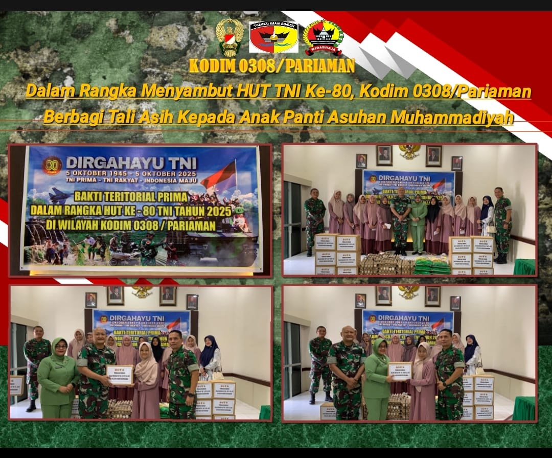 PARIAMAN,– Dalam rangka menyongsong Hari Ulang Tahun (HUT) ke-80 Tentara Nasional Indonesia (TNI), Kodim 0308/Pariaman melaksanakan kegiatan bakti sosial dengan memberikan tali asih dan sembako kepada anak Panti Asuhan Yayasan Muhammadiyah kota Pariaman yang berlokasi di Makodim 0308/Pariaman, Jln. Soekarno Hatta, Desa Toboh Palabah, Pariaman Selatan, Kota Pariaman, Sumatera Barat, Minggu (21/09/2025).