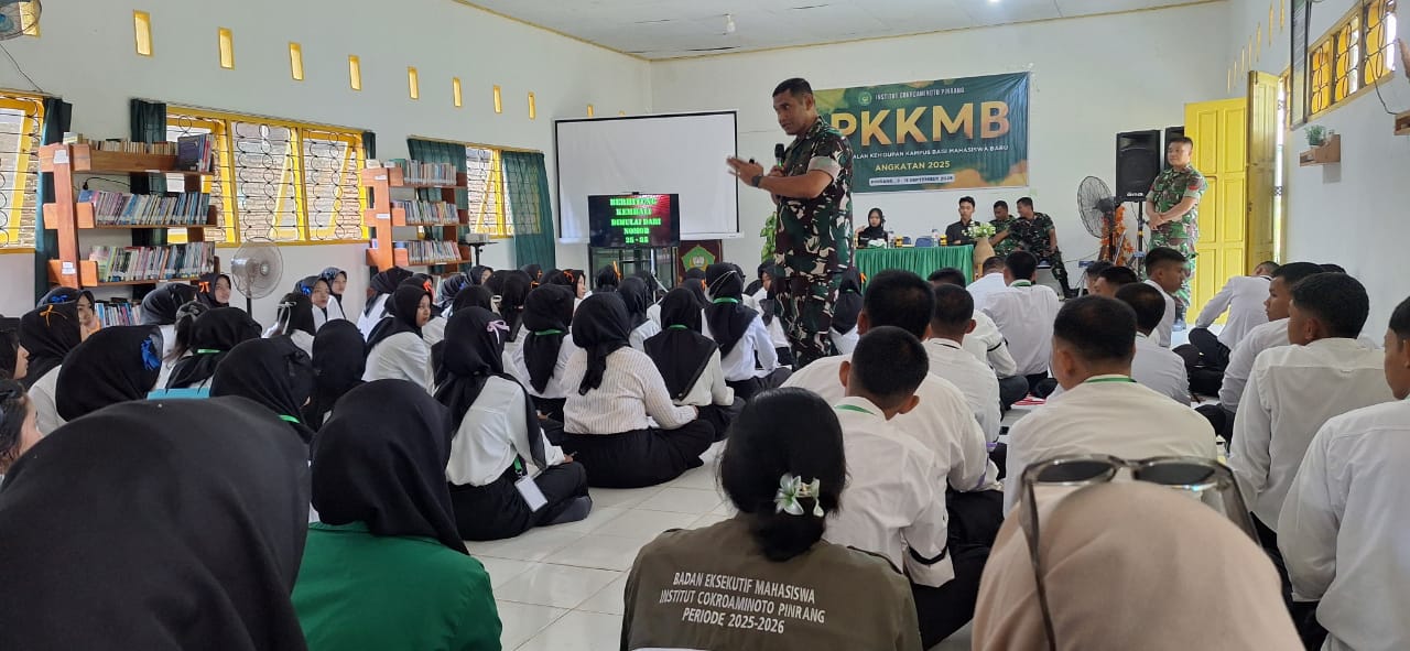 Pinrang_ Dalam rangka Pengenalan kehidupan Kampus Mahasiswa Baru (PKKMB) Institut Cokroaminoto Pinrang tahun 2025, Dandim 1404/Pinrang Letkol Inf Abdullah Mahua, S.H.I.,.M.M., memberikan materi Bela Negara dan Wawasan Kebangsaan kepada Mahasiswa Baru, Kamis (11/09/2025).
