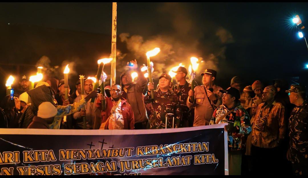 Letkol Inf Ari Iswoyo Timor, S.Hub. Int. (Dandim 1703/Deiyai) Mengikuti Pawai Obor Paskah yang di selenggarakan di Lap. Thomas Adii Wagete, Jl. Poros Bandara Kp. Wagete I, Distrik Tigi, Kab. Deiyai, Minggu 20 April 2025.