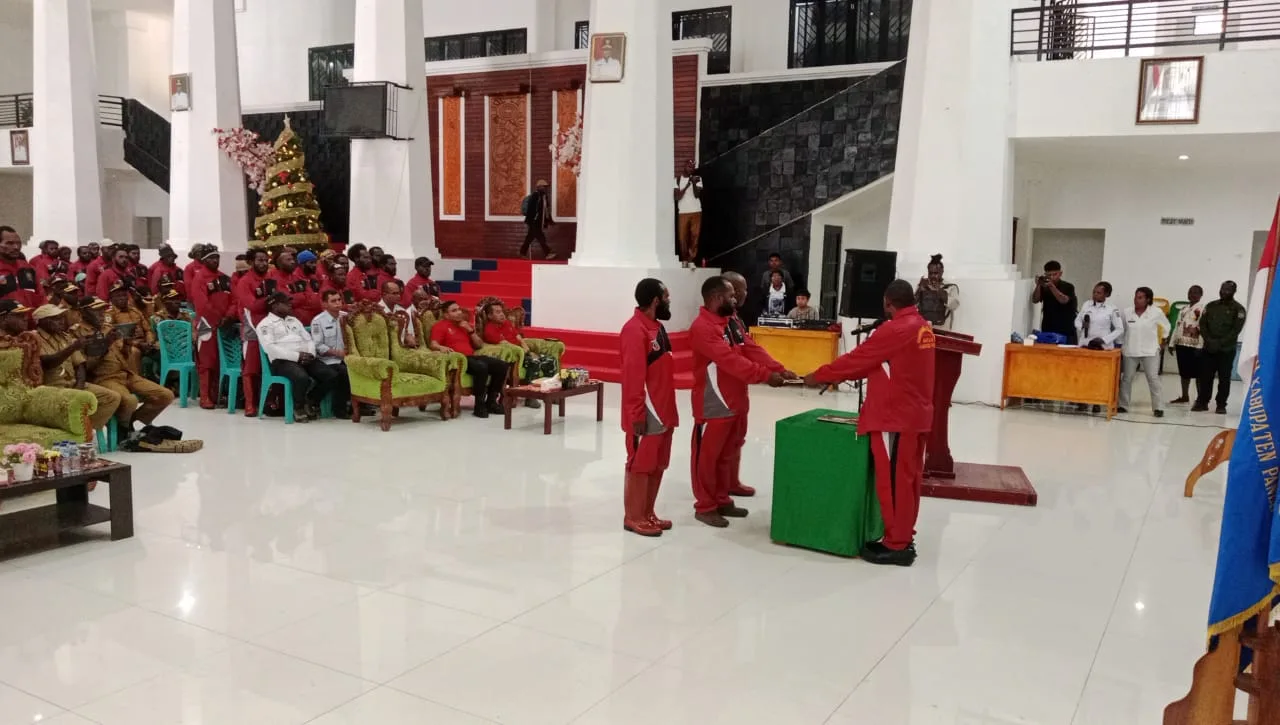 Paniai – Danramil 1703-01/Enarotali, Kapten Inf Eko Warsito, menghadiri kegiatan Pelantikan Satuan Tugas (SATGAS) Pembersihan Kampung dan Penanaman Pohon yang dilaksanakan di Aula Kantor Bupati Kabupaten Paniai, Jln. Raya Madi, Kampung Madi, Distrik Paniai Timur, Kabupaten Paniai, Provinsi Papua Tengah, kegiatan tersebut di Pimpin langsung Oleh Yampit Nawipa A.Md.Tek (Bupati Kabupaten Paniai) dan di Hadiri sekitar 150 Orang.