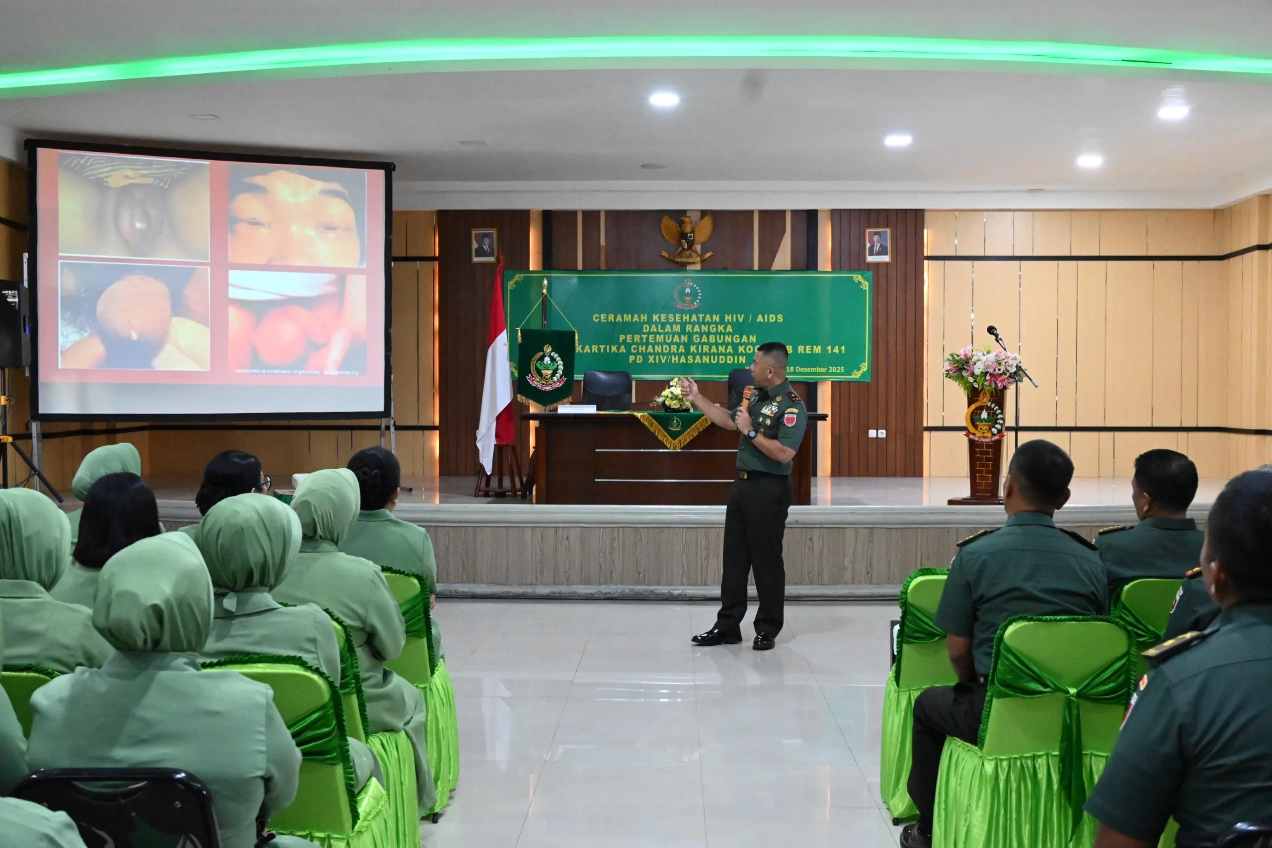 Bone – Persit Kartika Chandra Kirana Koorcab Rem 141 PD XIV/Hasanuddin menggelar kegiatan Ceramah Kesehatan HIV/AIDS dalam rangka Pertemuan Gabungan Persit Kartika Chandra Kirana Koorcab Rem 141 PD XIV/Hasanuddin di Aula Jenderal Sudirman Makorem 141/Tp. Kamis (18/12/2025)