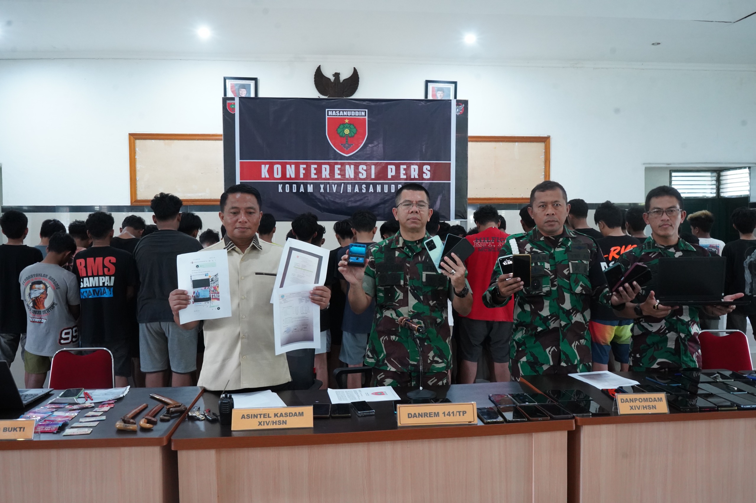 Turut hadir pula dalam Konferensi Pers tersebut, Kolonel Cpm Imran Ilyas (Danpomdam XIV/Hsn), Kolonel Inf Robinson Tallupadang S.ip (Asintel Kasdam XIV/Hsn), Kolonel Arm Gatot Awan Febrianto (Kapendam XIV/Hsn).