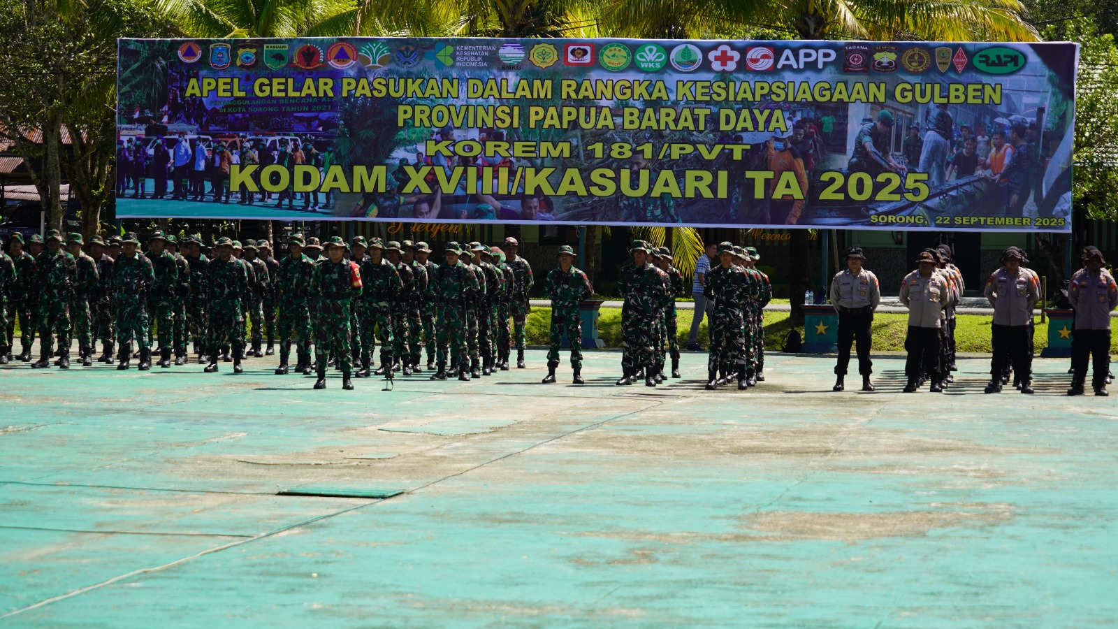Sorong-Papua Barat Saya, Danrem 181/Praja Vira Tama, Kolonel Inf Slamet Riadi, S.I.P., memimpin Apel Gelar Pasukan Kesiapsiagaan Penanggulangan Bencana di Makorem 181/PVT, Kota Sorong. Kegiatan ini diikuti sekitar 200 personel gabungan TNI, Polri, Pemerintah Daerah, dan instansi terkait, Senin (22/9/2025).