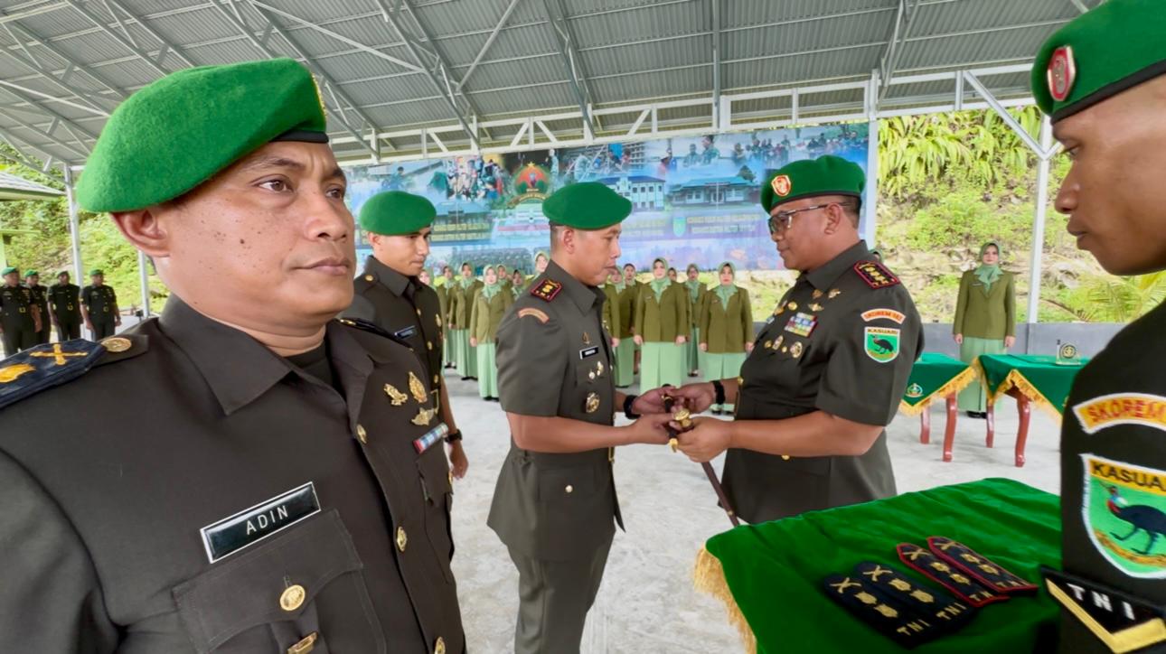 Komandan Korem 182/JO, Kolonel Inf Irwan Budiana, S.E., M.M., M.Han memimpin serah terima jabatan Komandan Kodim 1808/Manokwari Selatan dari pejabat lama, Letkol Inf Adin Suroyo, S.Sos, kepada Letkol Inf Irwansyah, S.Sos dan tradisi satuan bertempat di Garasi Serba Guna (GSG) Makorem 182/Jazira Onim, Di Kampung Kiat, Distrik Fakfak Barat, Senin, (5/5/2025)