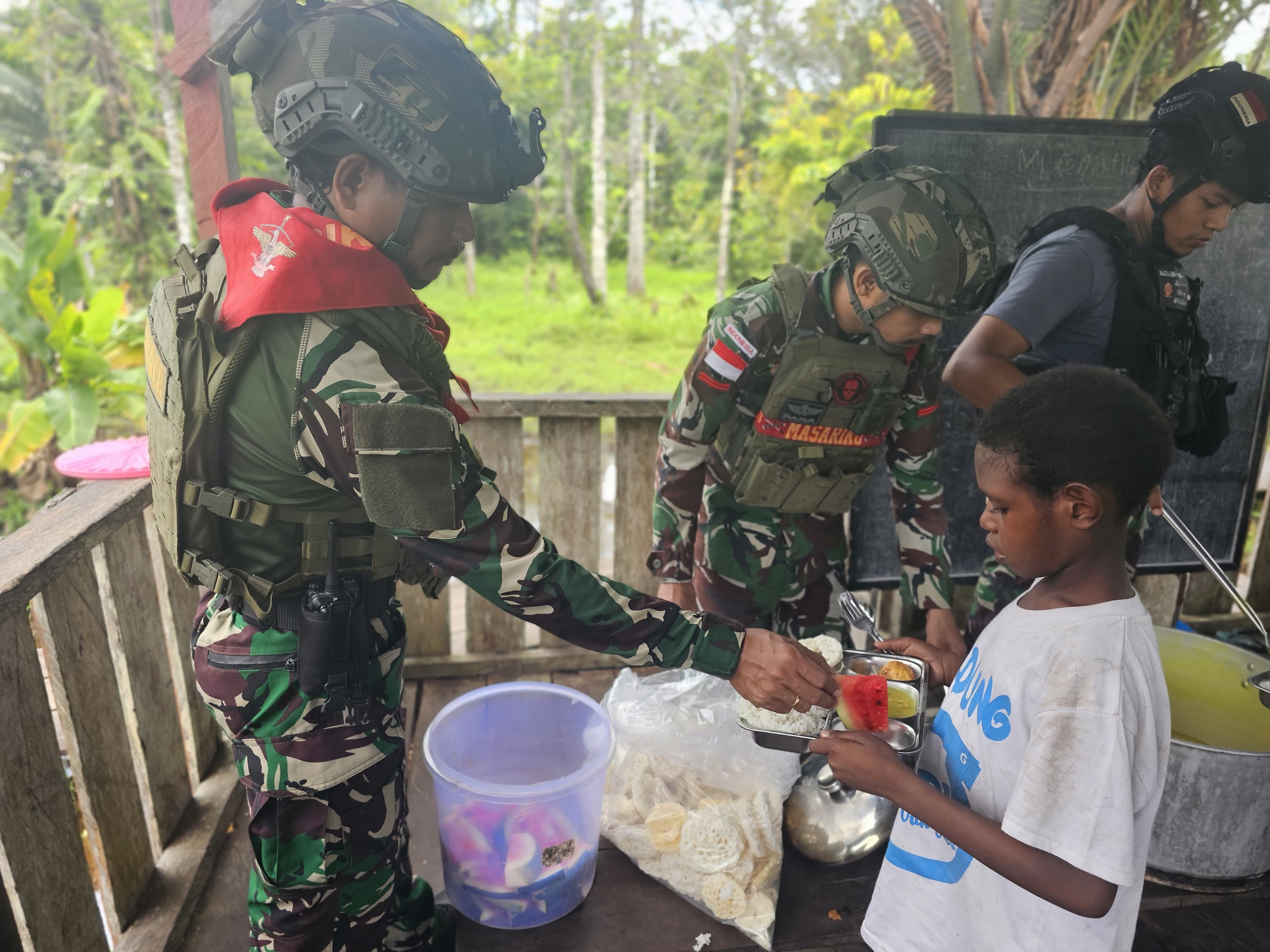 Papua, 06 September 2025 – Di tengah hutan belantara yang membatasi negeri, hadir secercah harapan dan kepedulian. Satuan Tugas Pengamanan Perbatasan (Satgas Pamtas) Mobile Yonif 733/Masariku menggelar program “Masariku Peduli Gizi” di SD Rimba Mumugu, Distrik Mumugu, Kabupaten Asmat. Kegiatan ini bukan hanya tentang memberikan makanan, tetapi juga menanamkan cinta dan perhatian untuk masa depan anak-anak di wilayah perbatasan.