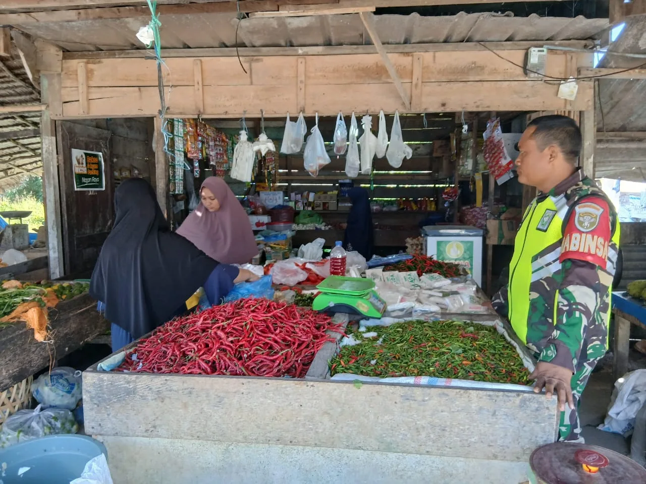 Babinsa turun langsung ke pasar tradisional untuk mengecek harga cabe hijau dan komoditas lainnya. Hal ini bertujuan mengontrol harga agar tetap stabil dan terjangkau oleh masyarakat.