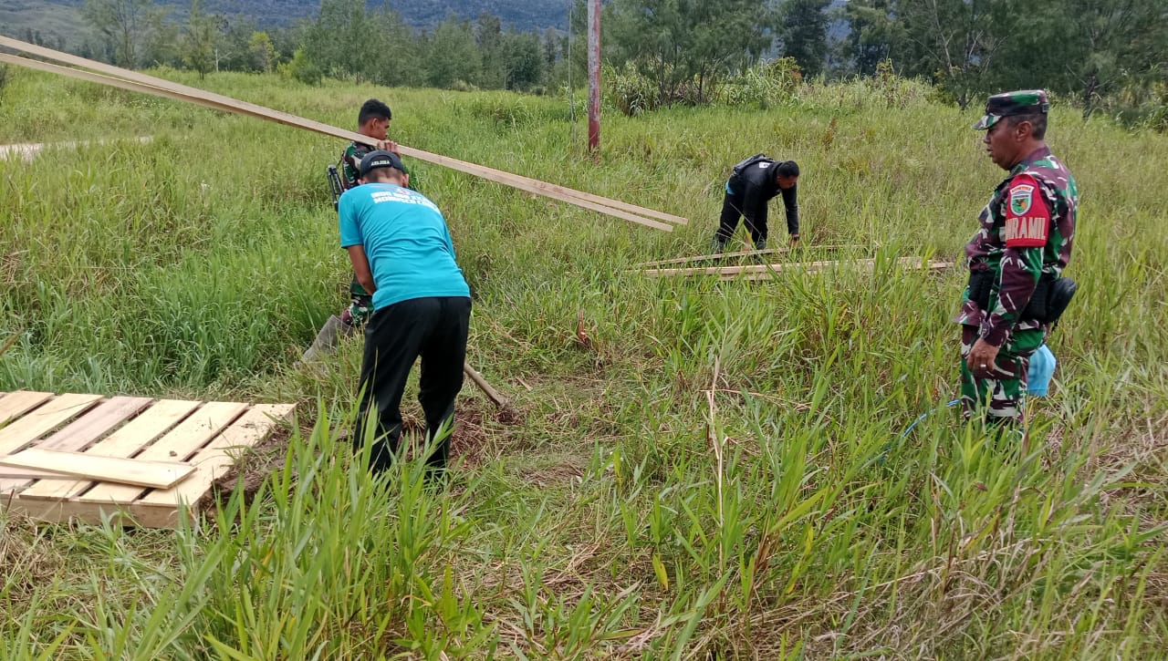 Bibida – Untuk memastikan proses pengerjaan Karya Bakti rehab Rumah Tidak Layak Huni (RTLH) di wilayah teritorial berjalan dengan lancar, Komandan Koramil (Danramil 1703-01/Enarotali) Kapten Inf Eko Warsito melakukan peninjauan lokasi serta pembangunan Jembatan agar memudahkan tukang untuk mengakut bahan bangunan dalam Pembangunan Rumah milik Bapak Kris Zonggonau yang beralamat di kampung Bibida, Distrik Bibida, Kabupaten Paniai, Kamis (31/07/2025)