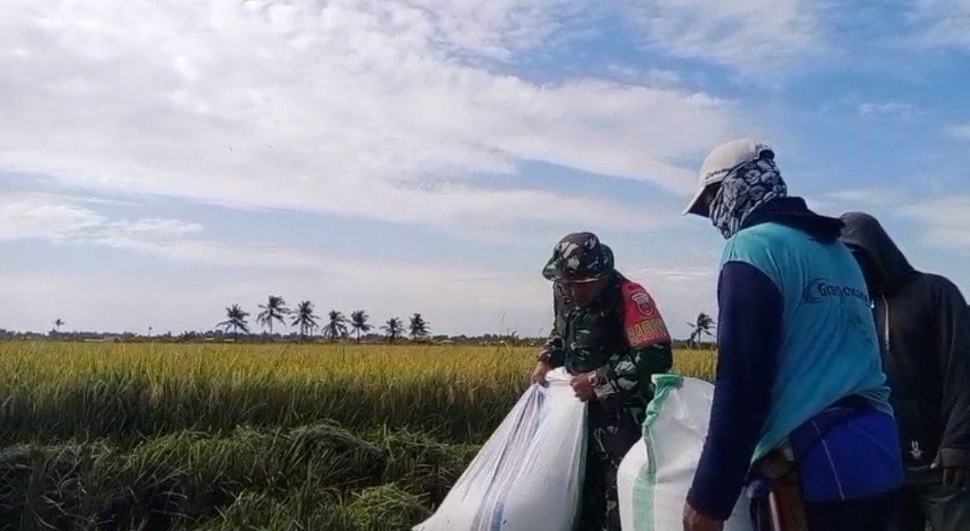 Babinsa Serka Mustaming dalam mendukung Ketahanan Pangan (Hanpangan) dengan semangat ikut serta terjun langsung ke sawah untuk membantu para petani desa binaannya saat memanen padi agar supaya terwujud kemanunggalan TNI dengan Rakyat.