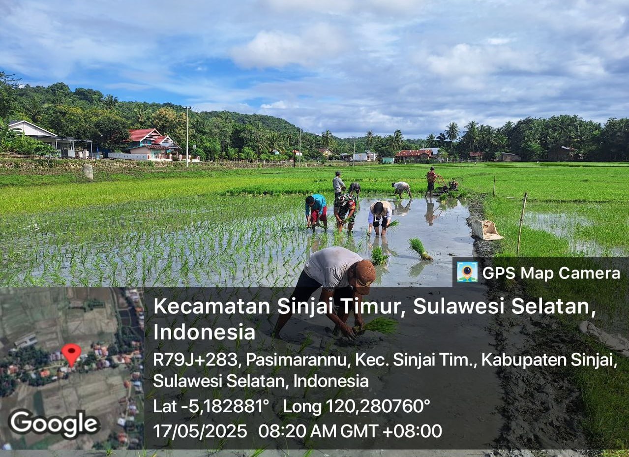 Sinjai – Babinsa Desa Pasimarannu Koramil 1424-04/Sinjai Timur, Sertu Mustari, bersama Petugas Penyuluh Lapangan (PPL), melaksanakan kegiatan pemantauan dan pendampingan penanaman padi di area persawahan milik Kelompok Tani Cabbeng’e dengan sistem tanam pindah bertempat di Dusun Sapoberu, Desa Pasimarannu, Kecamatan Sinjai Timur Kab Sinjai, Sabtu (17/05/2025)