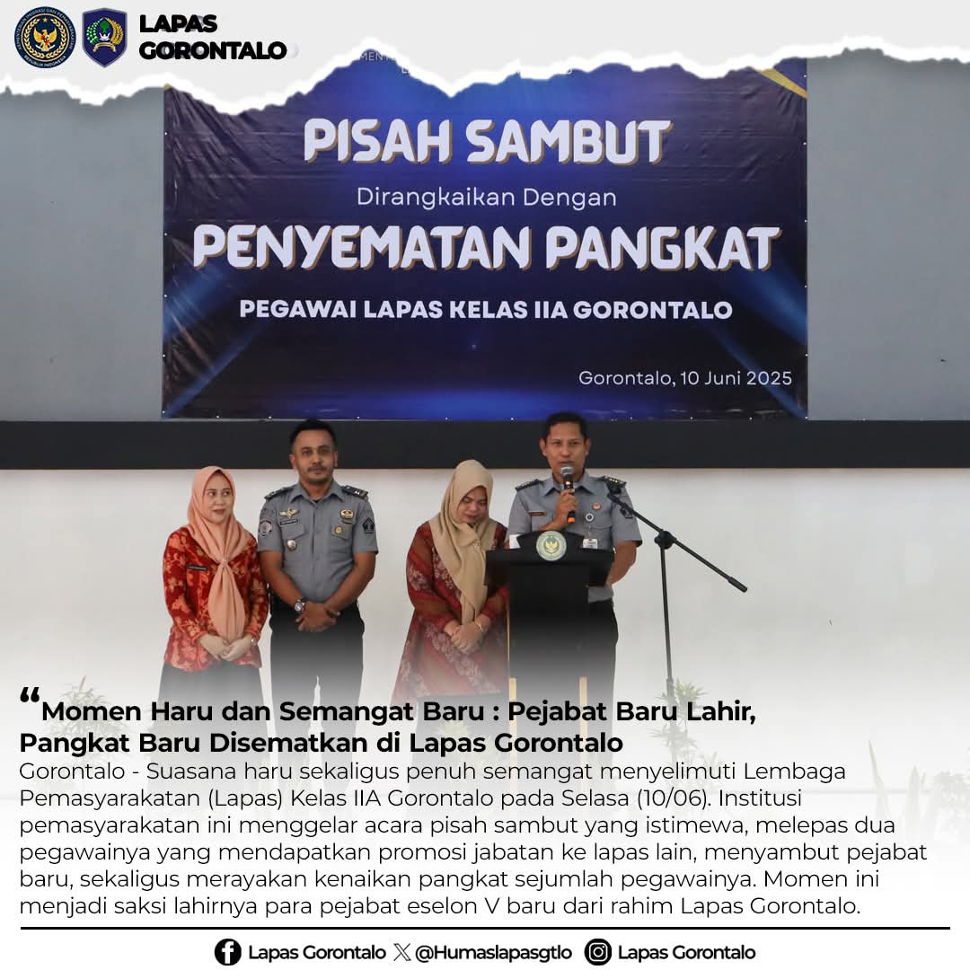 Gorontalo – Info_PAS : Suasana haru sekaligus penuh semangat menyelimuti Lembaga Pemasyarakatan (Lapas) Kelas IIA Gorontalo pada Selasa (10/06). suasana ini menyelimuti acara pisah sambut, pelepasan dua pegawai yang mendapat promosi jabatan ke Lapas lain dan menyambut pejabat baru, sekaligus merayakan kenaikan pangkat sejumlah pegawainya. Momen ini menjadi saksi yang bersejarah bagi Pegawai yang mendapat Promosi Jabatan .