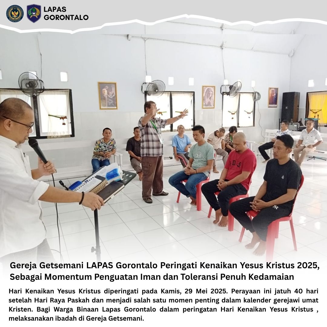 Gorontalo_Info_PAS : Hari Kenaikan Yesus Kristus diperingati pada Kamis, 29 Mei 2025. Perayaan ini jatuh 40 hari setelah Hari Raya Paskah dan menjadi salah satu momen penting dalam kalender gerejawi umat Kristen. Bagi Warga Binaan Lapas Gorontalo dalam peringatan Hari Kenaikan Yesus Kristus , melaksanakan ibadah di Gereja Getsemani.