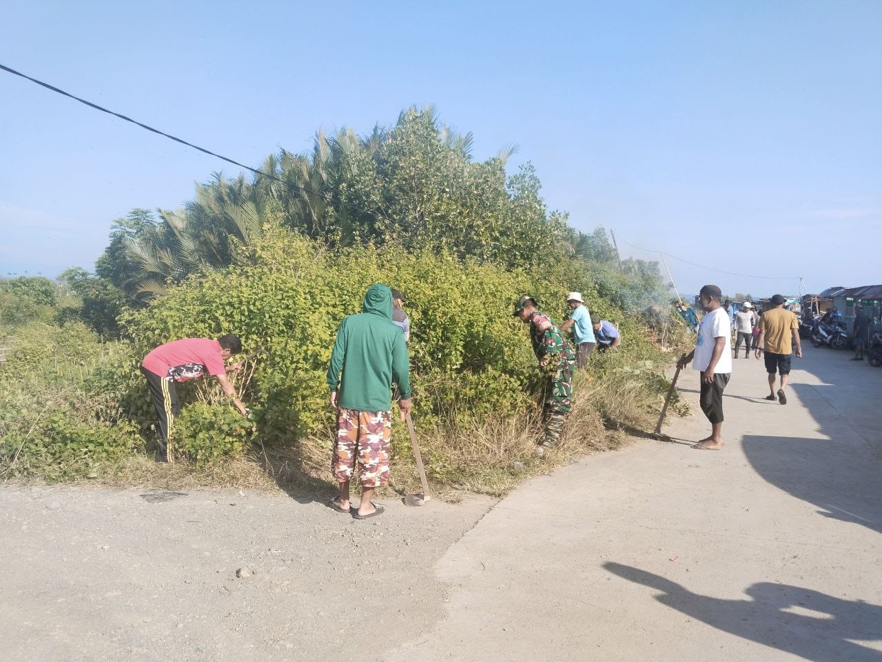 Kegiatan kerja bakti kali ini difokuskan pada pembersihan kiri dan kanan jalan yang selama ini dipenuhi rumput liar dan sampah ringan. Dengan semangat gotong royong, Babinsa dan warga bahu-membahu membersihkan area tersebut guna menciptakan kondisi lingkungan yang lebih nyaman, tertata, dan indah dipandang.