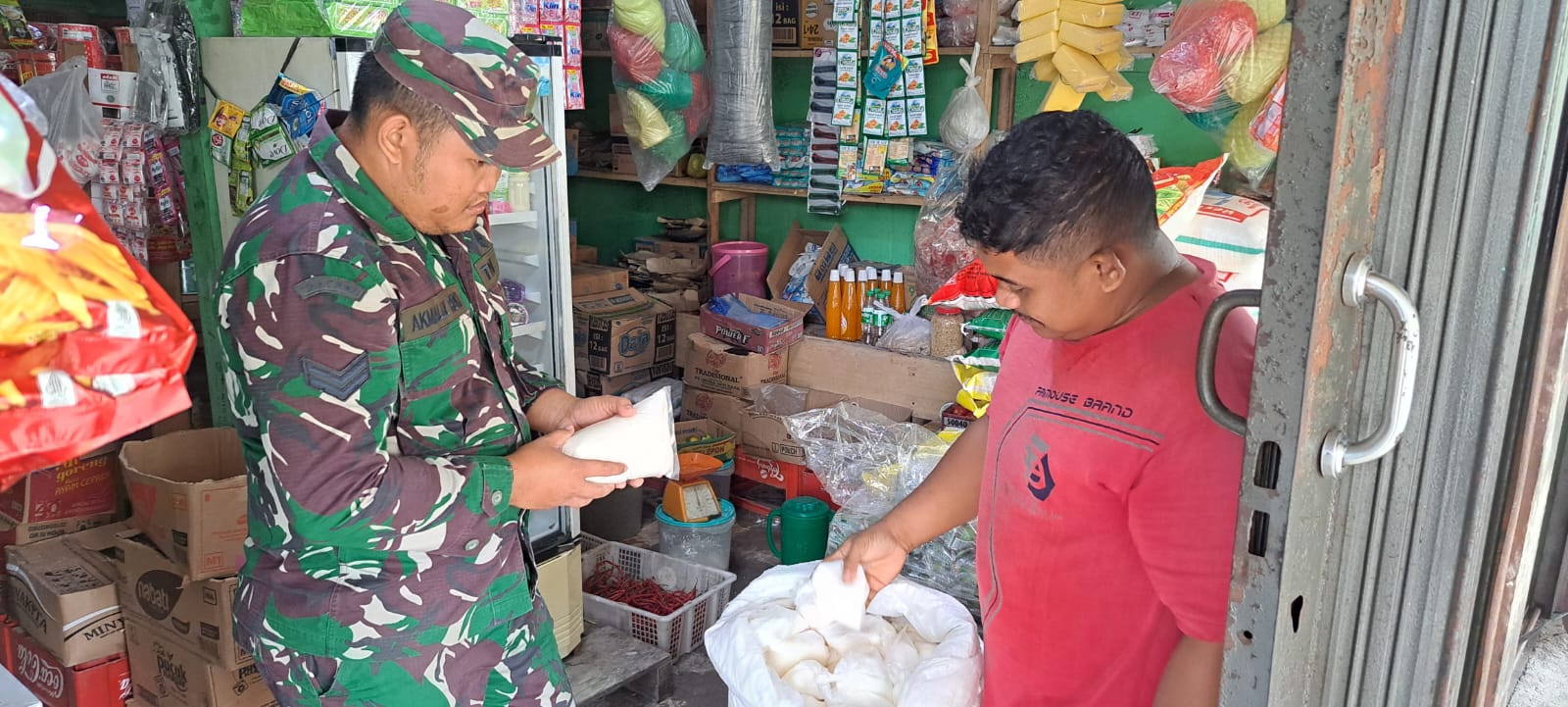 Simeulue – Babinsa Koramil 01/Simeulue Timur Sertu Akmalul Rizki melaksanakan pemantauan kebutuhan pokok warga dan perkembangan harga sembako serta keamanan di lasar wilayah binaannya bertempat di Desa Desa Suak Buluh Kec Simeulue Timur Kab. Simeulue. Senin (07/04/2025).