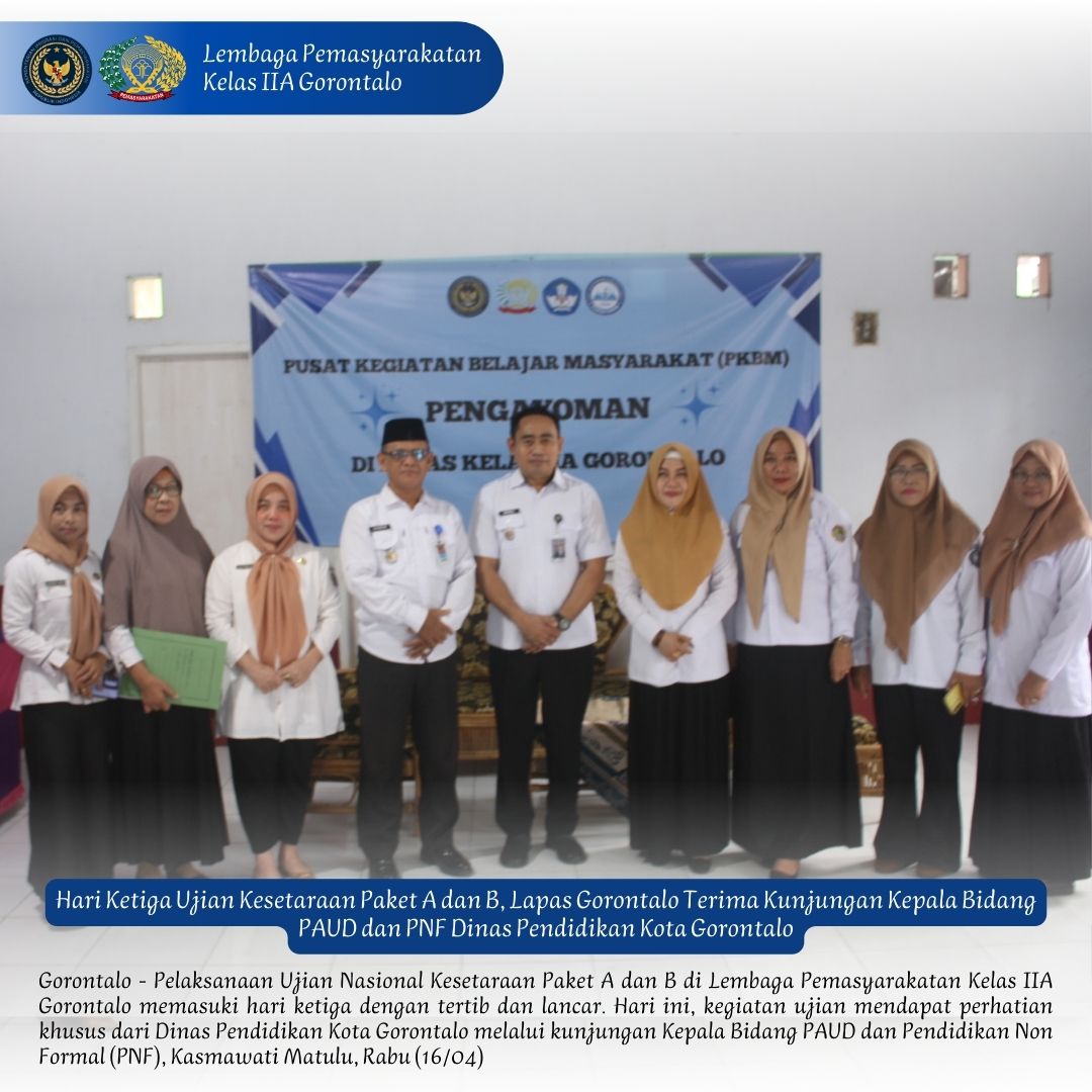 Gorontalo, – Pelaksanaan Ujian Nasional Kesetaraan Paket A dan B di Lembaga Pemasyarakatan Kelas IIA Gorontalo memasuki hari ketiga dengan tertib dan lancar. Hari ini, kegiatan ujian mendapat perhatian khusus dari Dinas Pendidikan Kota Gorontalo melalui kunjungan Kepala Bidang PAUD dan Pendidikan Non Formal (PNF), Kasmawati Matulu, Rabu (16/04).