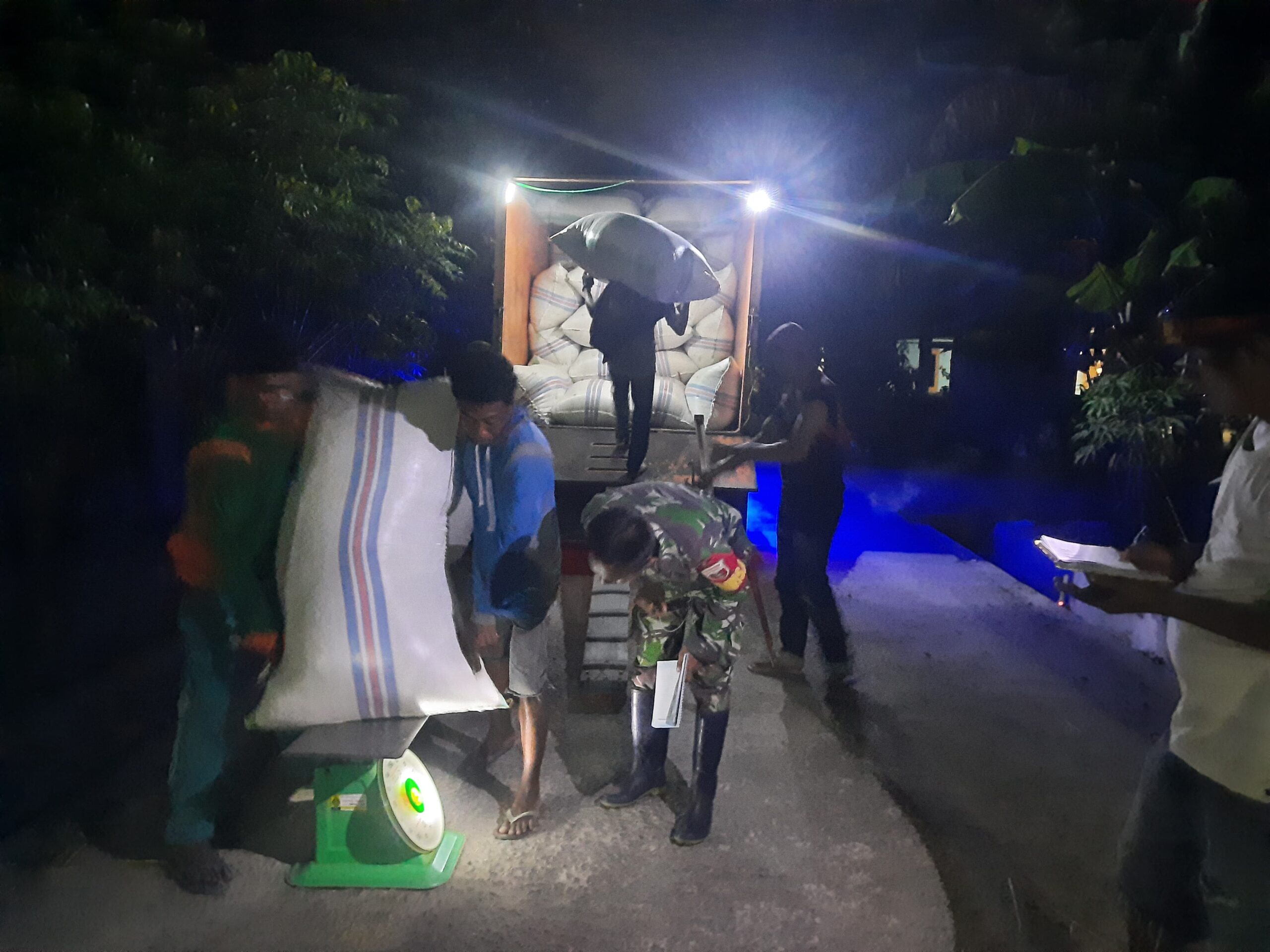Pinrang_ Babinsa Koramil-04/Paleteang Kodim 1404/Pinrang Serda Amiruddin melaksanakan pendampingan serap gabah petani secara kontinyu dari siang hingga malam hari di Kelurahan Sipatokkong Kecamatan Watang Sawitti Kabupaten Pinrang, Senin (21/04/2025).