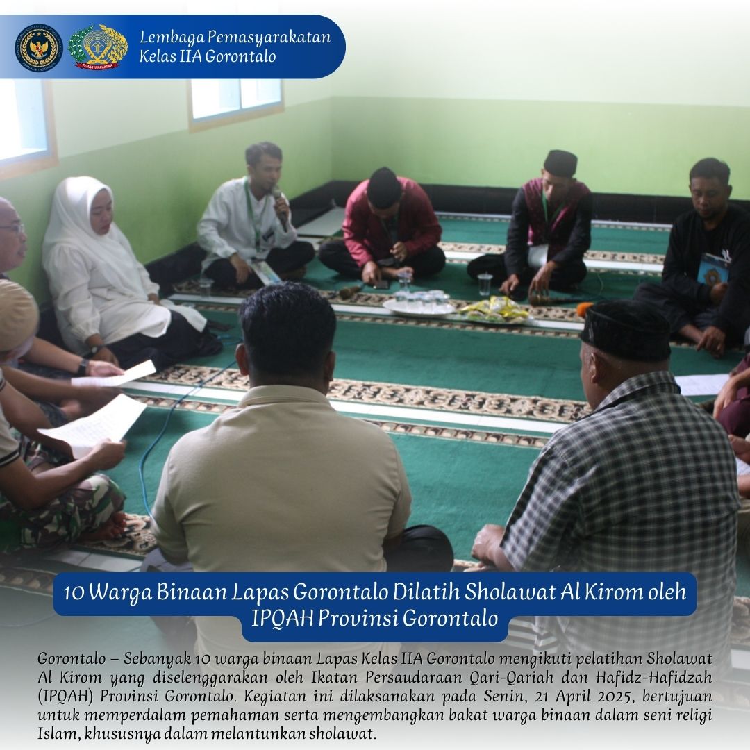 Gorontalo _ Selasa (22/04) bertempat diselasar Masjid At-Taubah, tampak warga binaan Lapas Kelas IIA Gorontalo tekun mengikuti pelatihan Sholawat Al 2Kirom yang diselenggarakan oleh Ikatan Persaudaraan Qari-Qariah dan Hafidz-Hafidzah (IPQAH) Provinsi Gorontalo, Kasdin Lato selaku Kasibinadik Lapas Gorontalo saat ditemui awak media menyampaikan bahwa kegiatan ini adalah salah satu program pembinaan yang akan diikuti oleh warga binaan yang beragama Islam, walaupun tidak semuanya, namun yang paling penting adalah bagaimana kami bisa menanamkan kecintaan kepada Rasulullah SAW, ujar Kasdin yang lebih lanjut menyampaikan bahwa Sholawat Nabi Muhammad adalah bentuk penghormatan dan doa bagi Rasulullah SAW, yang telah menjadi teladan sempurna bagi umat Islam. Sholawat bukan hanya ungkapan cinta dan rindu, tetapi juga sarana untuk mendekatkan diri kepada Allah SWT. Mari kita telaah bersama bacaan sholawat dan maknanya, sambil merenungkan keindahan dan kecemerlangan cahaya ilahi yang disampaikan melalui sholawat.