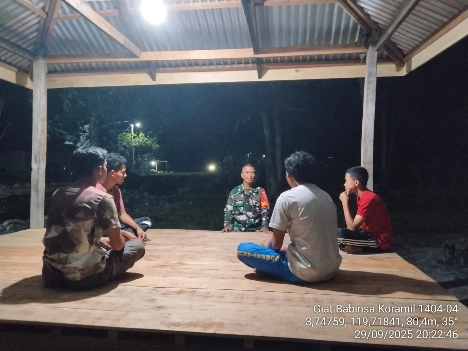 Pinrang_ Dalam rangka menjaga keamanan dan ketertiban di wilayah binaan, Babinsa Koramil-04/Paleteang Kodim 1404/Pinrang Serka Amiruddin melaksanakan patroli malam dengan menyambangi warga yang sedang melaksanakan ronda malam di Poskamling Lingkungan Sulili Timur Kelurahan Mamminasae Kecamatan Paleteang Kabupaten Pinrang, Rabu (01/10/2025).