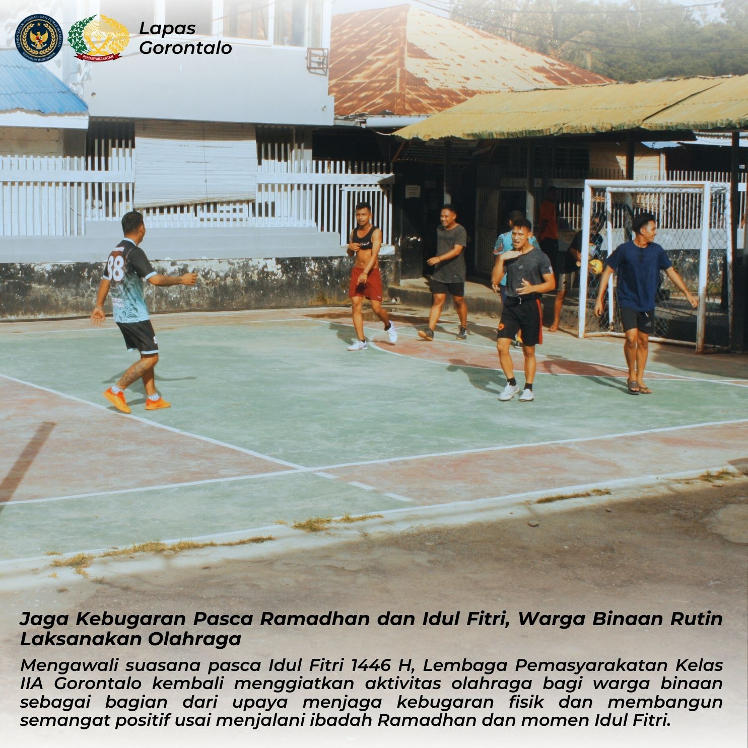 Gorontalo_ Selasa (08/04) – Mengawali suasana pasca Idul Fitri 1446 H, Lembaga Pemasyarakatan Kelas IIA Gorontalo kembali menggiatkan aktivitas olahraga bagi warga binaan sebagai bagian dari upaya menjaga kebugaran fisik dan membangun semangat positif usai menjalani ibadah Ramadhan dan momen Idul Fitri.