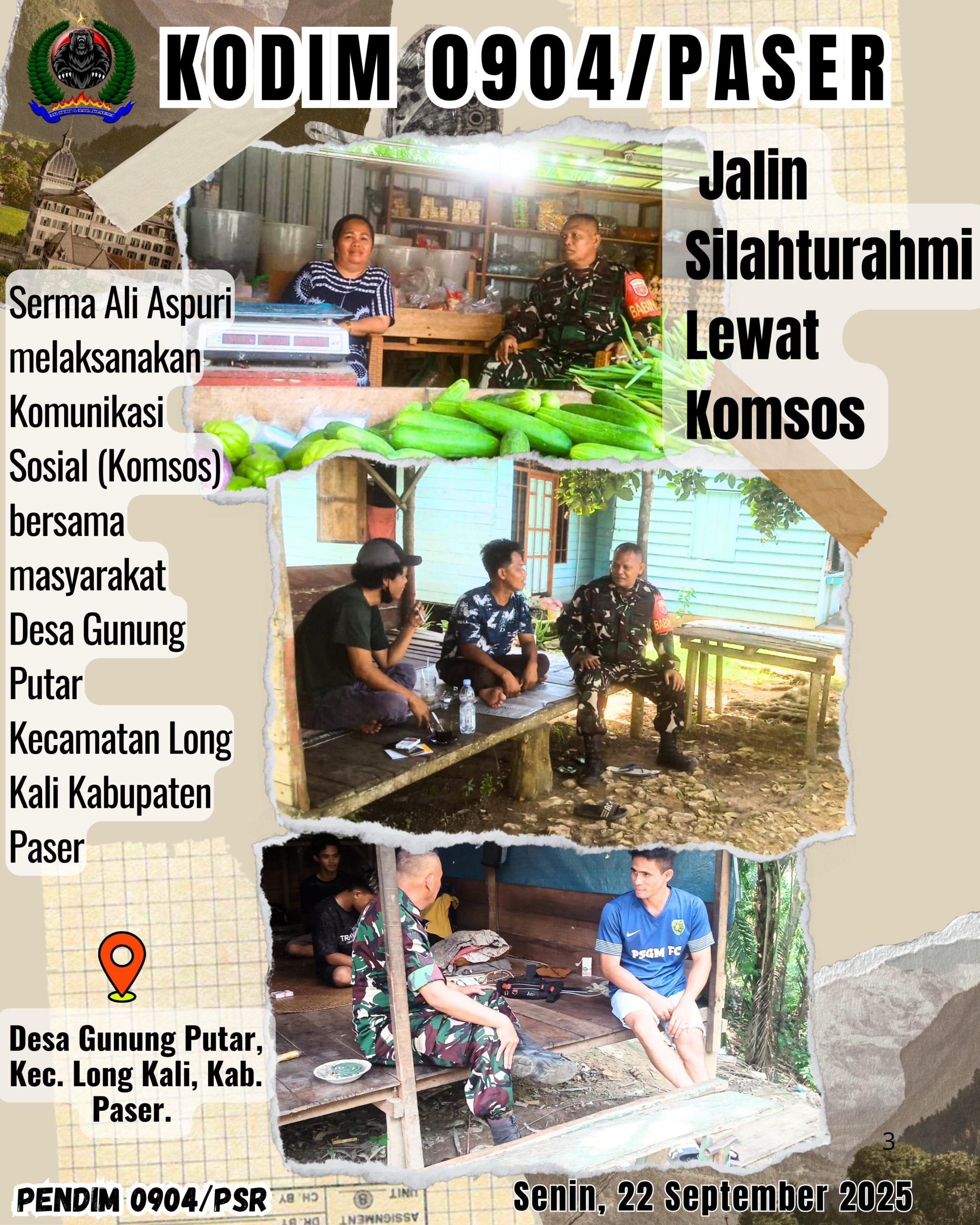 Kodim 0904/Psr, Korem 091/ASN, Kodam VI/Mlw – Babinsa Koramil 0904-03/Long Kali Serma Ali Aspuri melaksanakan Komunikasi Sosial (Komsos) bersama masyarakat Desa Gunung Putar, Kecamatan Long Kali Kabupaten Paser, Senin (22/9/2025).