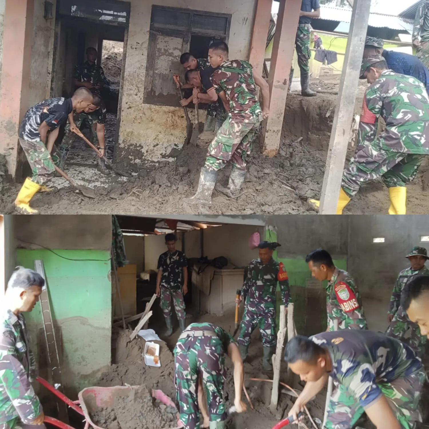 Tanpa mengenal lelah, prajurit gabungan dari Kodim 0102/Pidie, Yonif TP 857/GG, Yonif TP 836/BY, dan Yon Armed 17/RC terlihat bergotong royong membersihkan rumah milik Ilyas di Desa Meunasah Raya, Kecamatan Meurah Dua. Senin (16/02/2026).
